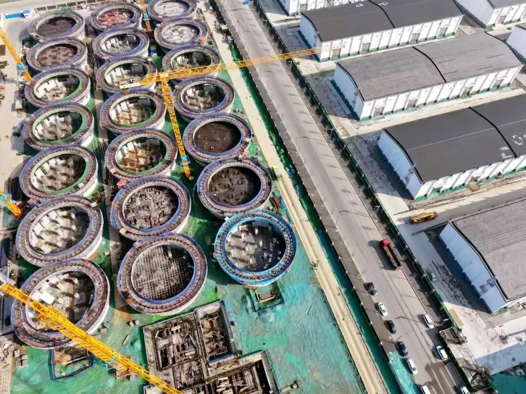 西地块一期建设同样如火如荼。21个浅圆仓筒仓4米以下主体结构已全部浇筑完成,其中4个夹层板结构已浇筑到位,另有2个正在进行模板钢筋施工。机修器材库1-3层框架结构浇筑完成,预制梁板施工进度过半。