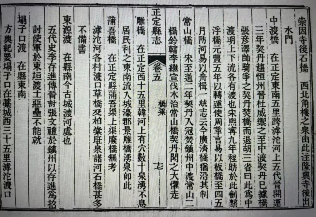 最近这一百年随着现代科技的发展人们的忘性就更大了,滹沱河岸边的塌子口渡、落凌口渡、陈村口渡、高基口渡、柳林铺口渡和东垣渡一样都被人们遗忘了。可是我们在历史典籍里依然能够看到它们的蛛丝马迹,光绪年间修订的《正定县志》里滹沱河漫溢、溃堤、浸灌、筑坝等词汇就占了很大篇幅,仅赵文濂就撰写过《重修里宅村滹沱河护村新堤记》《漕马口堤斜角堤说》《重挑护城河记》《重修斜角堤迵水堤及漕马口堤碑记》等碑文,由此也可窥见古代滹沱河的洪水泛滥是多么的频繁,滹沱河南北交通只能靠船渡。
