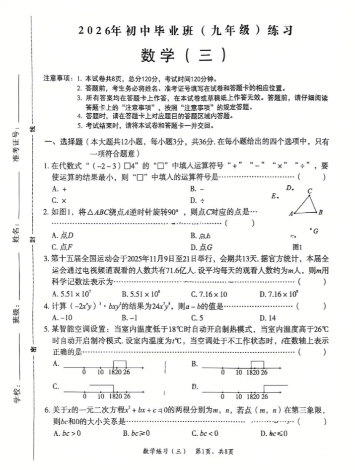 2026年3月石家庄长安区初中毕业年级教学质量检测数学试卷(含答案后附下载链接)
