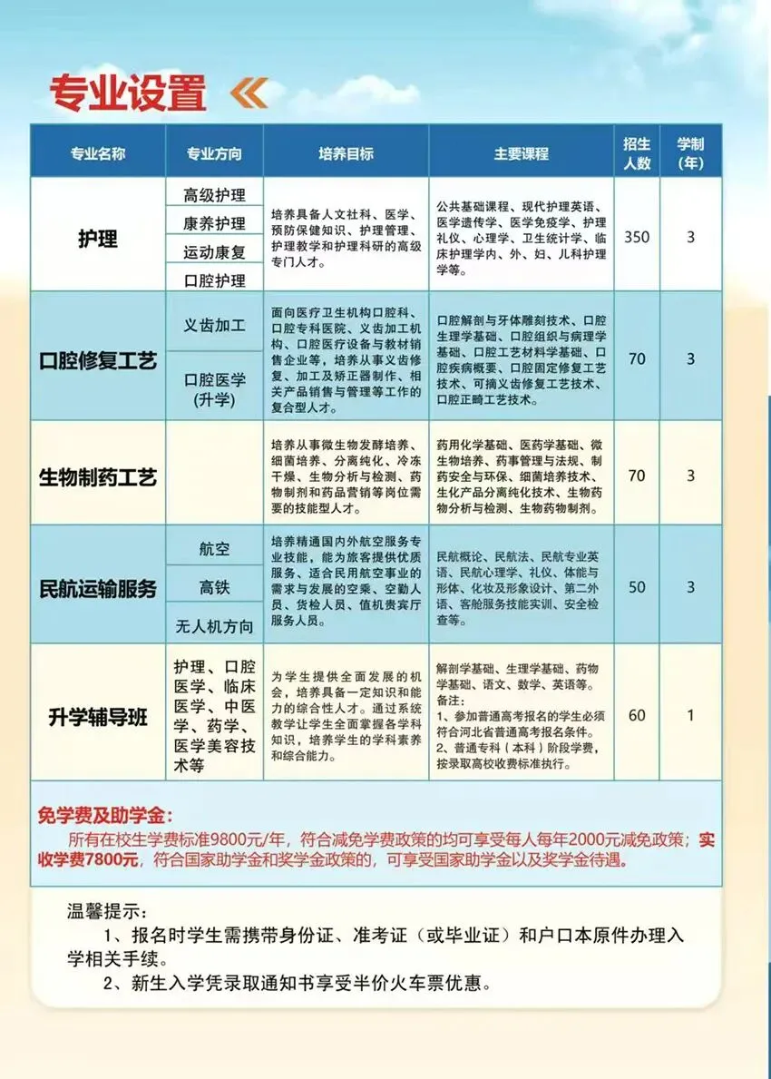 口腔医学类专业、护理类专业、生物制药类专业、对口升学(单招)升学班。