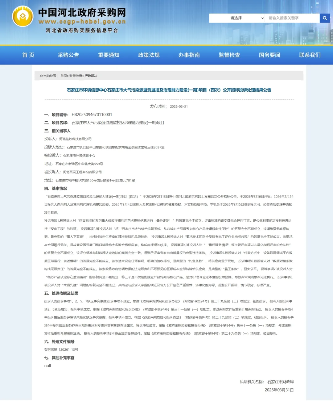 探针财经从中国河北政府采购网获悉,2026年3月31日,石家庄市财政局发布《石家庄市环境信息中心石家庄市大气污染源监测监控及治理能力建设(一期)项目(四次)公开招标投诉处理结果公告》,文号为石财采投〔2026〕13号。