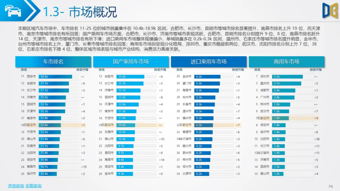 当前石家庄汽车市场呈现 “乘用车高端化、卡车重型化”的分化特征:进口豪华车与大排量重卡需求坚挺,自主 / 合资乘用车与轻中型卡车全面承压,新能源转型缓慢,仅混合动力与局部县域市场存在增长机会,短期市场复苏压力较大。