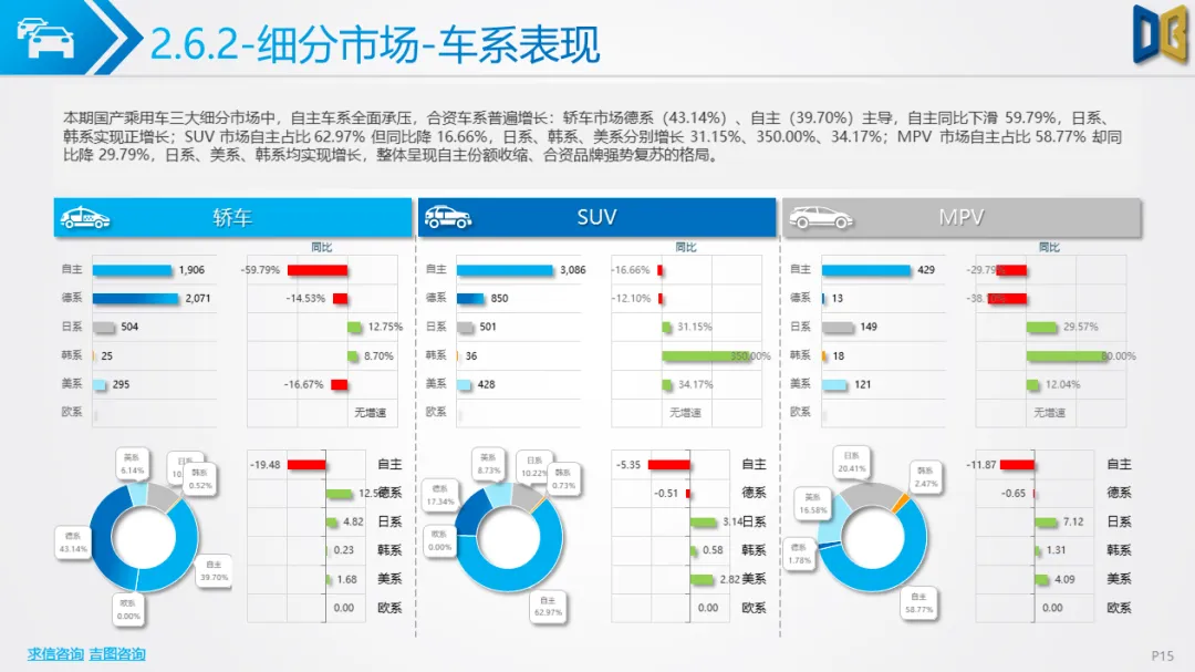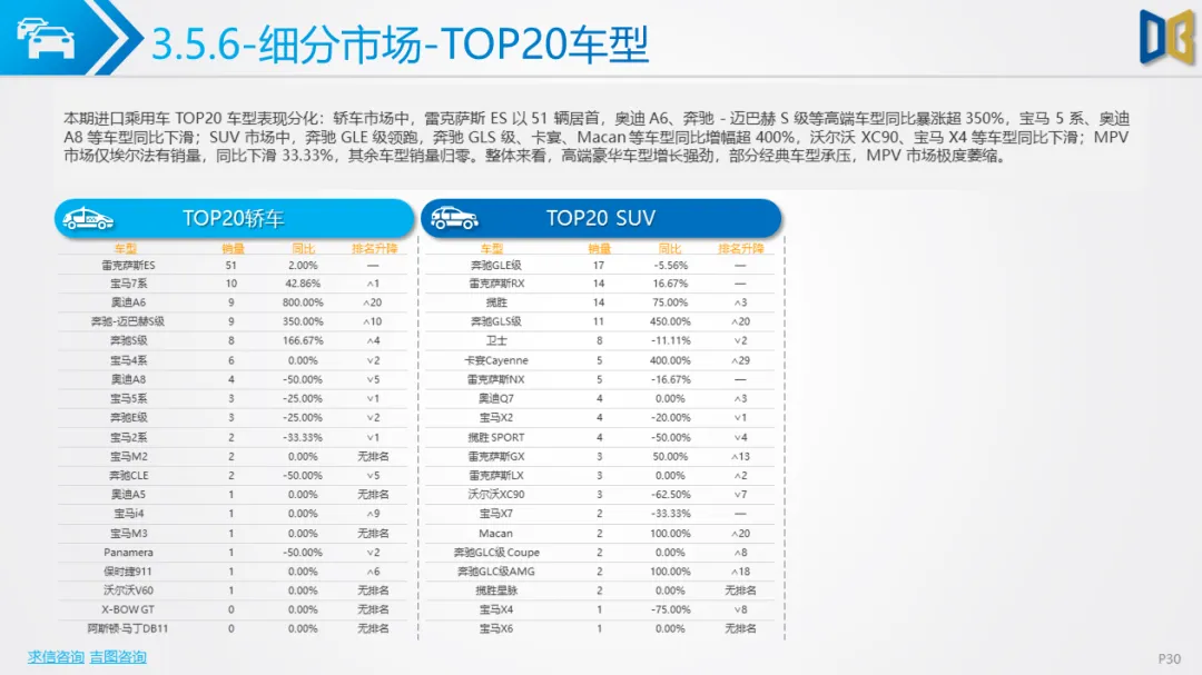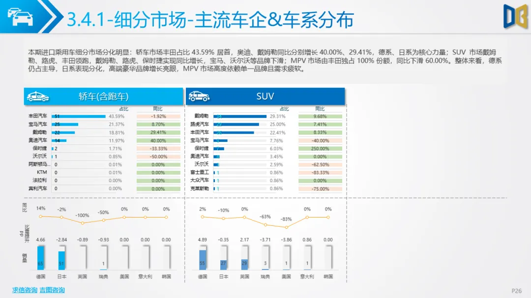 进口乘用车:中高端大级别车型(C 级、D 级轿车 / SUV)主导市场,奥迪 A6、奔驰GLS 级等超豪华车型同比暴涨超350%,成为增长核心;MPV市场高度依赖丰田单一车型,需求萎缩明显;动力结构以大排量燃油为主,新能源转型滞后。