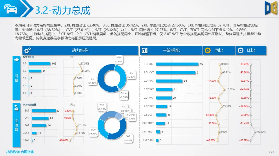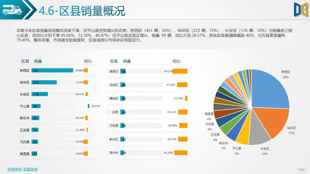 排量与区域:12000-12999ml大排量车型占比39.01%,需求坚挺;区县市场中仅平山县同比增长28.57%,其余区县普遍降幅超40%,桥西区、裕华区为核心销量区域。
