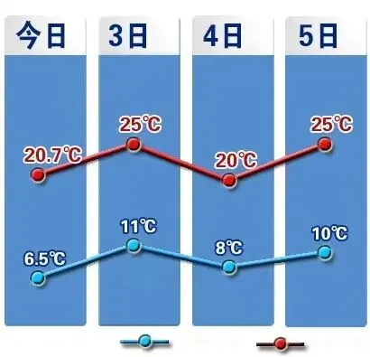 24—48小时预报:今天夜间:多云转阴有零星阵雨 风向风力:偏北风2~3级 最低气温:11℃ 明天白天:多云间阴有分散性阵雨或雷阵雨转晴 风向风力:偏北风5~6级,阵风7~9级,伴有浮尘或扬沙 最高气温:25℃ 明天夜间:晴间多云 风向风力:偏北风4~5级转2~3级 最低气温:8℃ 后天白天:晴转多云 风向风力:偏南风4~5级,阵风6~7级 最高气温:20℃ 后天夜间:多云转晴 风向风力:偏北风2~3级 最低气温:10℃ 3—5天预报(08—08时):4月5日:晴间多云 偏北风3~4级 10~25℃4月6日:晴间多云 偏北风4级 9~22℃4月7日:晴转多云 偏南风2~3级 7~16℃