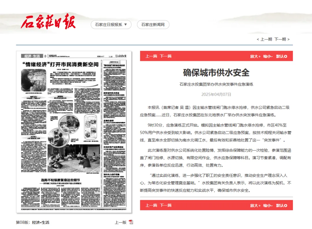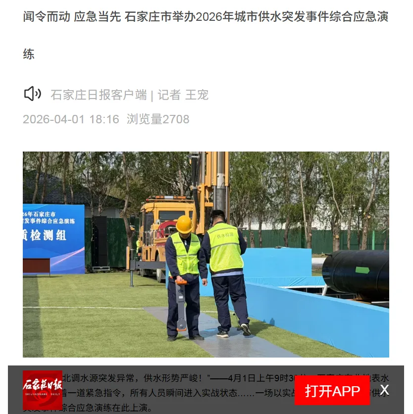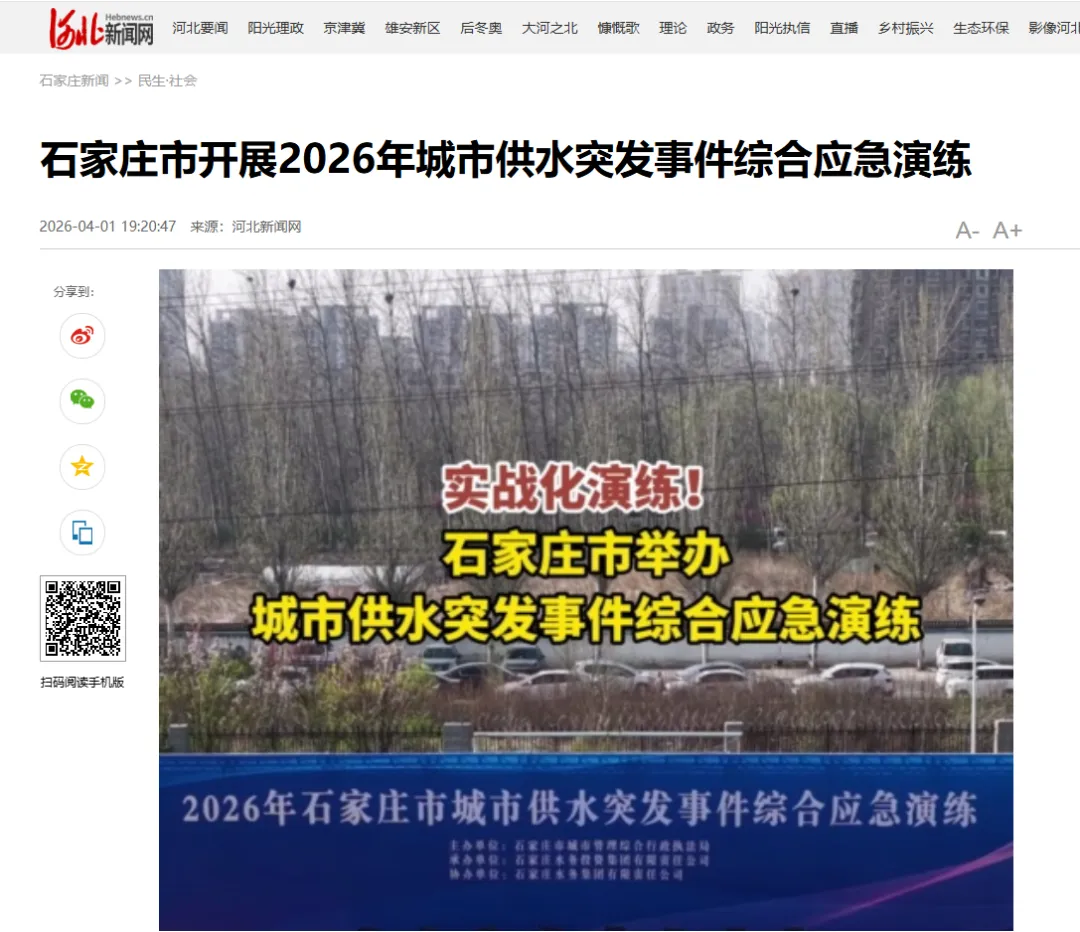 为及时控制和处置城市供水突发事件,全面提高应急反应速度和抢险救援能力,4月1日,由石家庄市城管局主办,水投集团承办、水务集团协办的2026年石家庄市城市供水突发事件综合应急演练在石家庄东北地表水厂举行。河北新闻网、河北网络广播电视台、冀时新闻、纵览新闻客户端、石家庄日报、石家庄新闻网、无线石家庄、石家庄发布、民生关注等多家媒体及门户网站持续进行了宣传报道,取得良好社会效应。