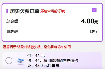 目前补缴历史订单,可通过购买海川能源加油充值卡的方式,直接抵扣相应停车费用,实惠又便捷。