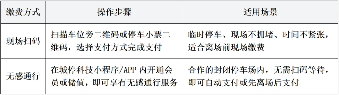 小程序/APP自主缴:微信搜索城停科技小程序,或下载城停科技APP,手机号登录后,系统会自动显示未缴订单,一键完成支付。