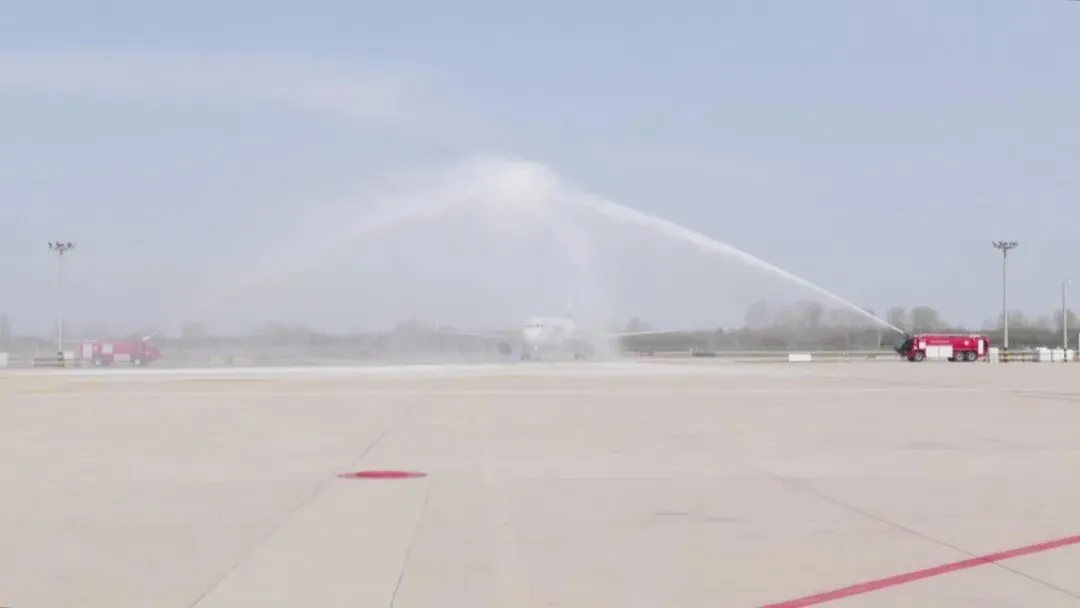 昨天下午14点10分,在石家庄正定国际机场跑道的一侧,两辆消防车向天空喷洒水柱,形成一个水门状的弧形水幕,以民航界最高礼遇“过水门”的仪式,庆祝石家庄—韩国清州国际航线圆满完成首航。据了解,首航航班搭载165名韩国旅客入冀,他们将前往东太行、广府古城、赵云庙等景点,沉浸式体验河北独特的自然风貌与人文魅力,推动“这么近,那么美,周末到河北”文旅品牌与国际市场深度对接。