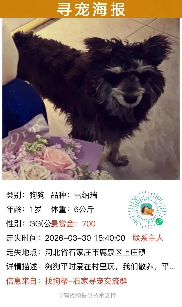 #石家庄寻狗# 鹿泉区上庄镇附近走失一只雪纳瑞,如有好心人看到或者收留请联系主人或本平台