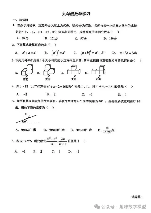 2026年3月河北初中学业水平摸底考数学试卷