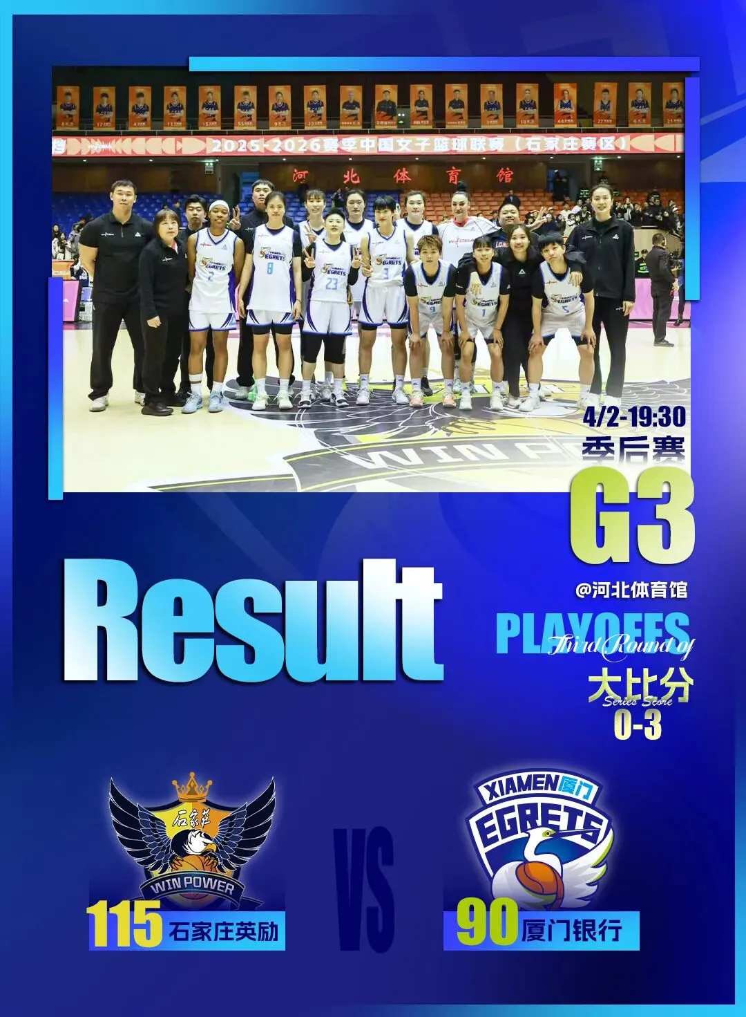 下半场,厦门银行的表现开始出现下滑,分差很快就被拉开到两位数,在围绕着10分左右的分差僵持很久之后再次落入下风,分差在末节已经达到20分,比赛就此失去悬念,最终厦门银行再负对手,大比分0-3结束首次季后赛之旅。