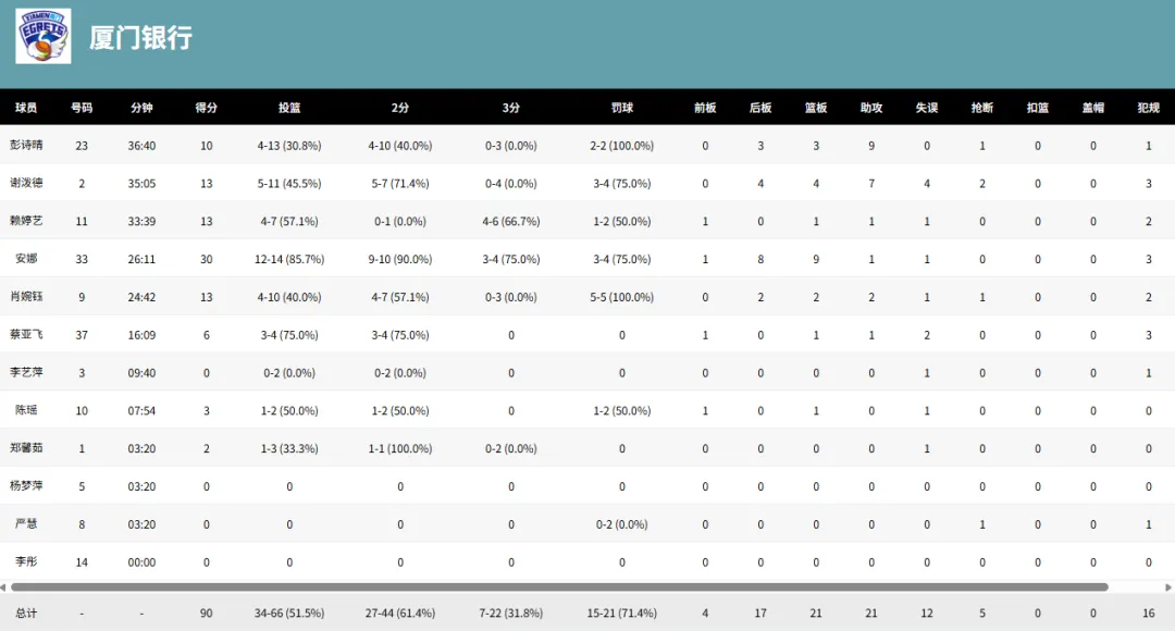 球队方面,厦门银行整体投篮命中率52%和三分命中率32%,均低于石家庄英励的60%和47%;篮板球则是28-38输了10个。厦门银行对石家庄英励两名外援安妮莉和凯拉·戴维斯的防守做得不好,两人都是拿到30+合计轰下70分之多。球员方面,安娜、谢泼德、赖婷艺、肖婉钰和彭诗晴五人均得分上双,其中安娜独得30分。