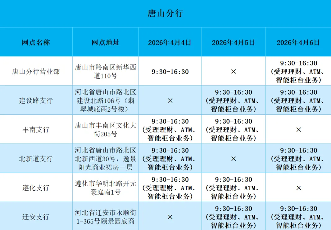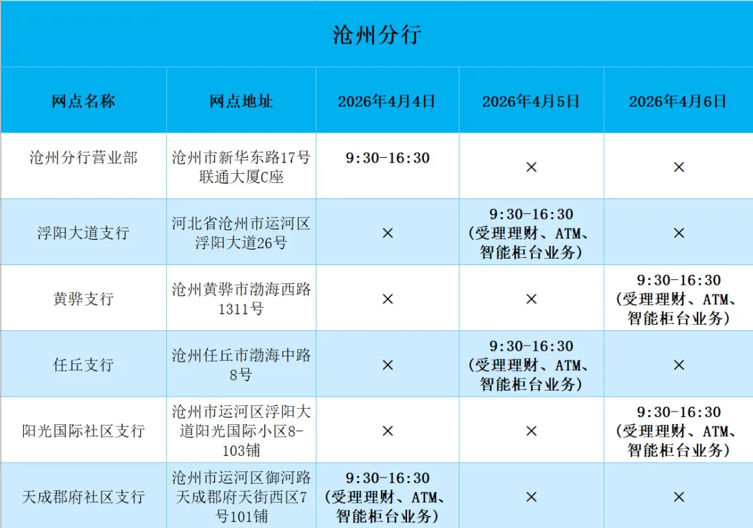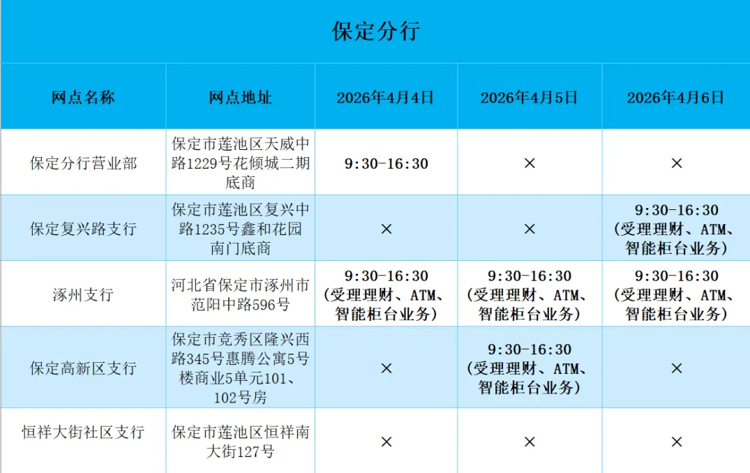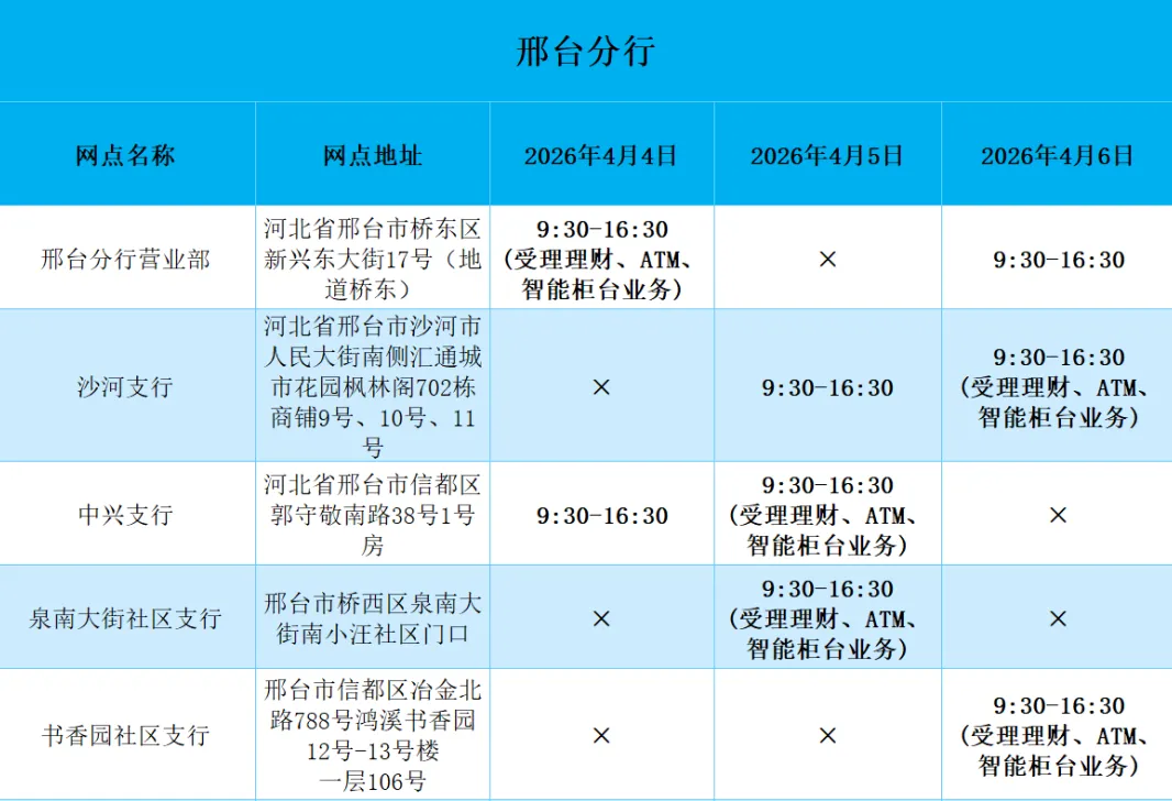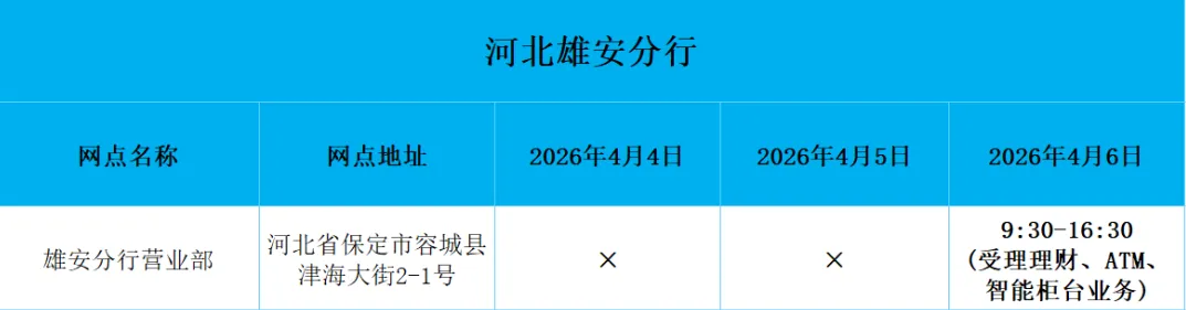 2026年清明假期营业网点安排如下
