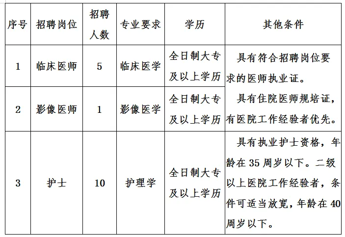 招聘岗位:护士10名、医师等