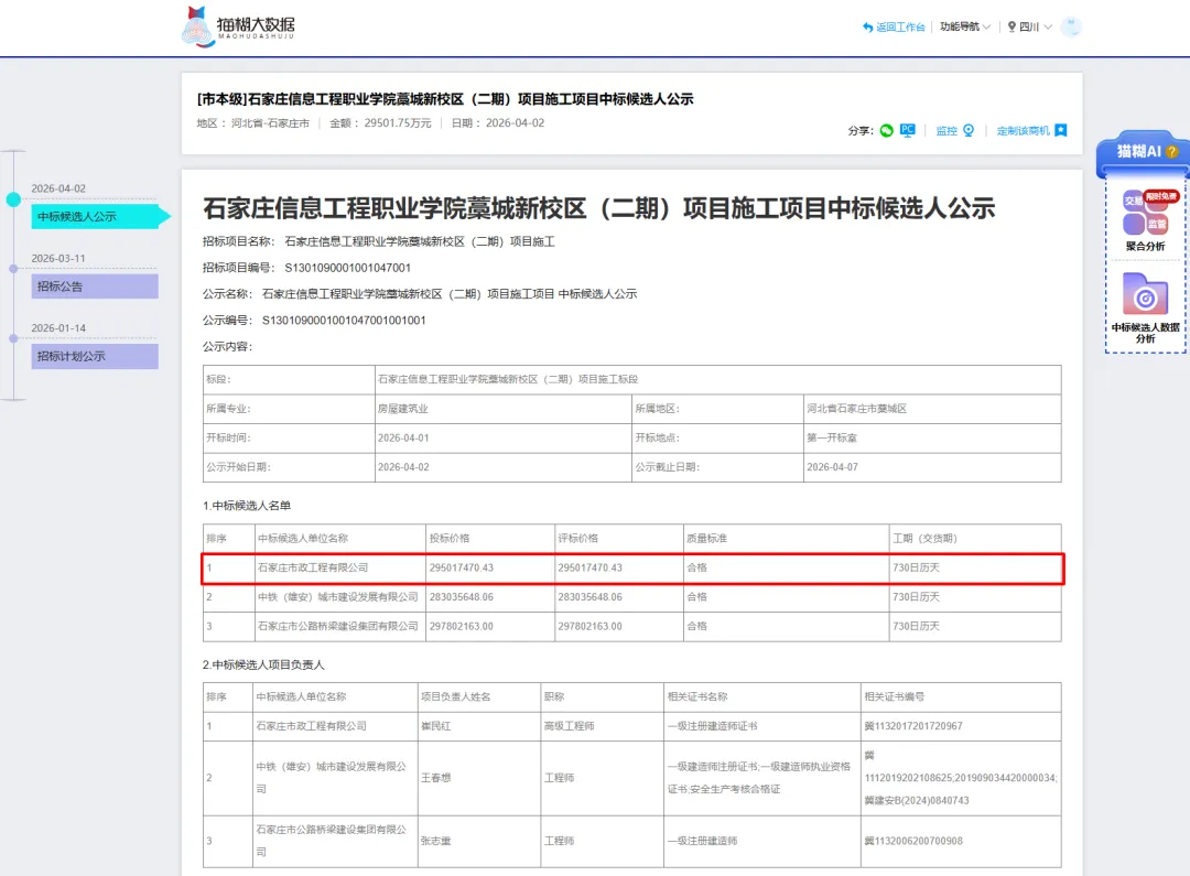 该项目于4月1日正式开标,共有17家投标人参与投标。最终由石家庄市政工程有限公司以2.9501亿元成功中标。项目计划工期为730个日历天。