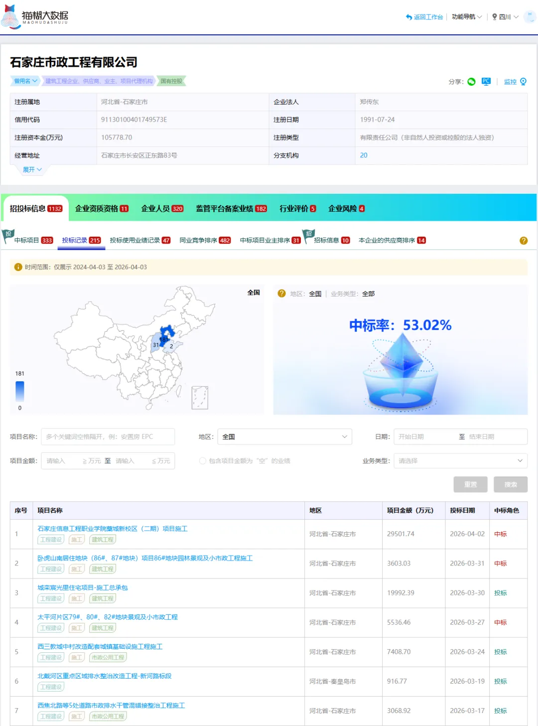 如果您想了解该中标人的招投标经营状况,可以通过猫糊平台的“企业查询”来查看该企业在过去两年内全国各地的投标记录。