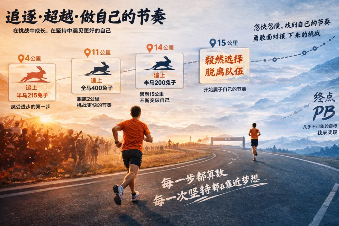 比赛的前半程,对于我来说就像是一场“追兔子”的游戏。在4公里处,成功追上了半马215兔子;11公里时,又追上了全马400兔子,并跟跑了2公里;14公里时,追上半马200兔子,还跟到了15公里。在这个过程中,不断地挑战自己的速度和耐力,努力追赶着前面的目标。每一次追上兔子,感受到了自己的进步和成长。
