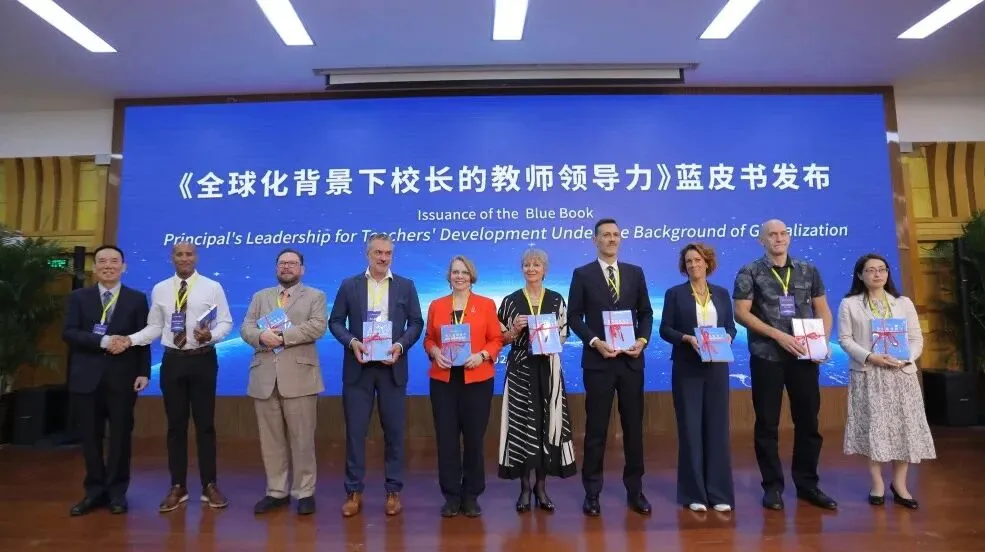 右图:《全球化背景下校长的教师领导力》主编、石家庄外国语教育集团党委书记强新志先生为与会嘉宾代表赠送蓝皮书。