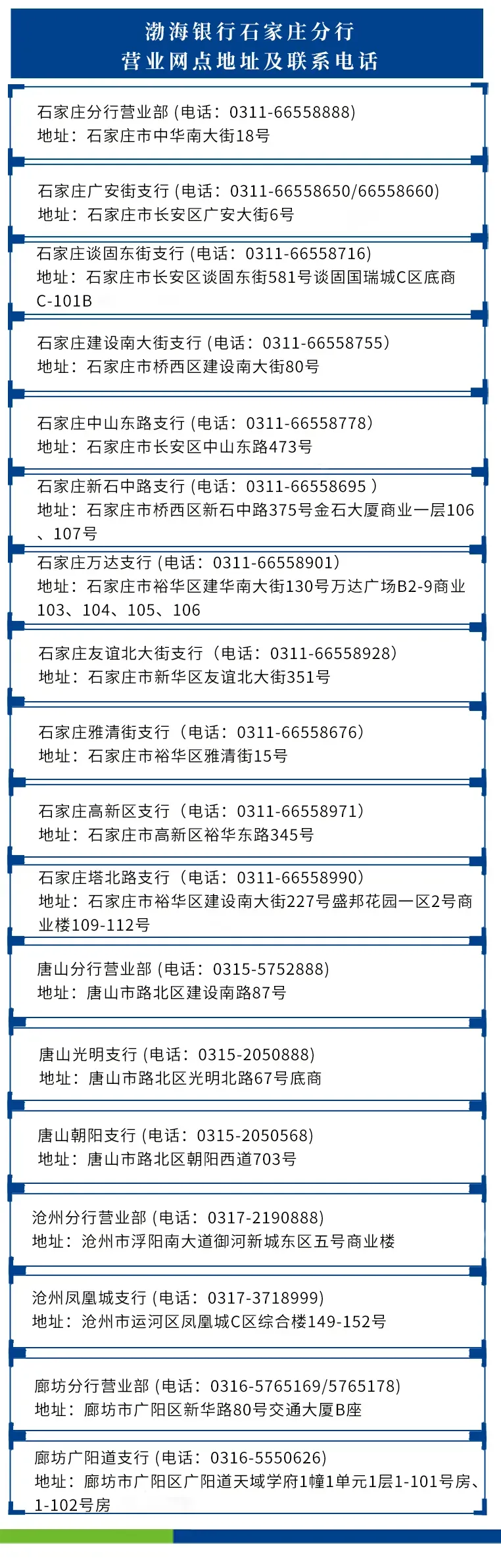 2、本微信所引用的数据及产品信息,均以渤海银行官方网站最新公布及产品说明书为准。如需引用本微信的内容,不得对内容做出有悖于我行意愿的删节和修改,并请注明出处。