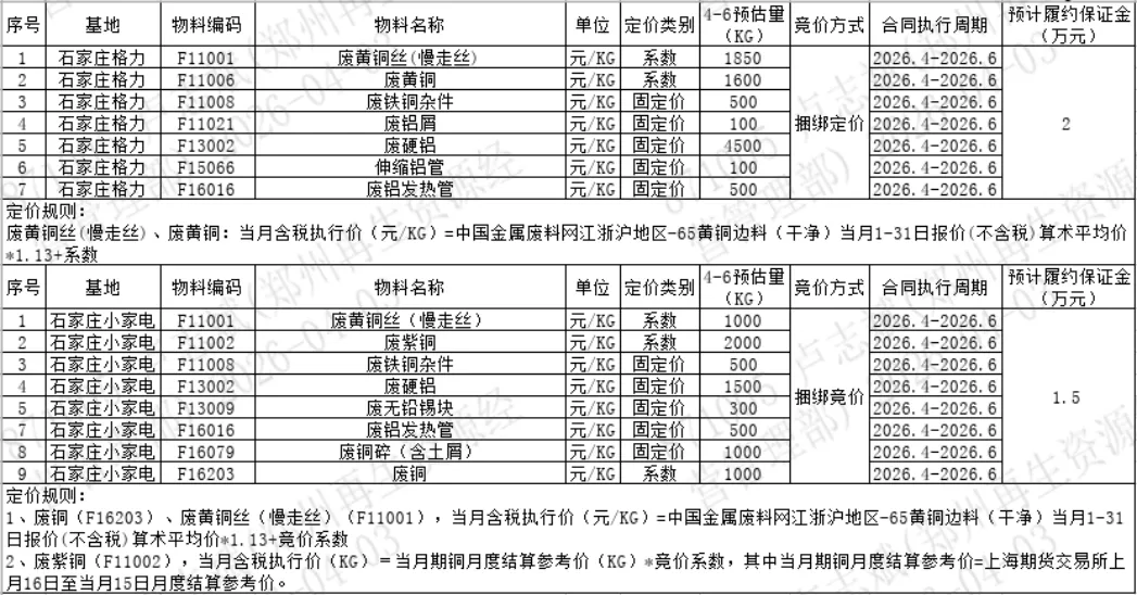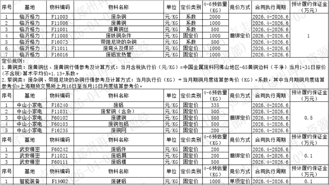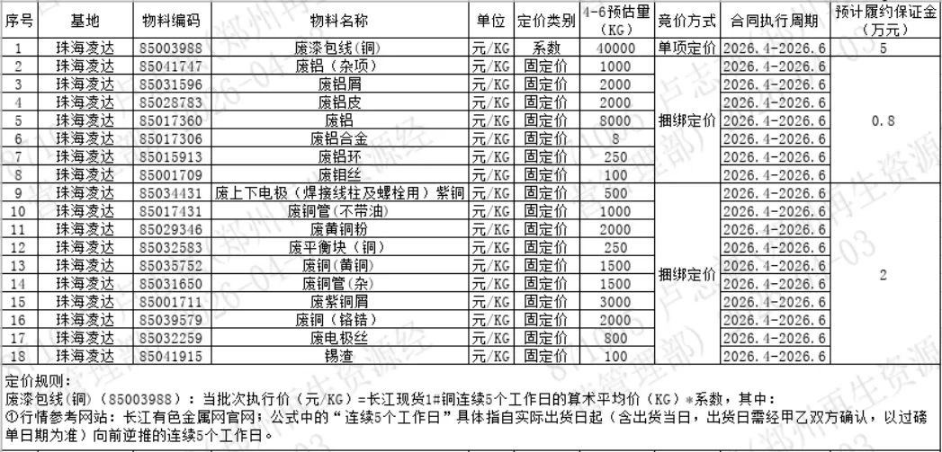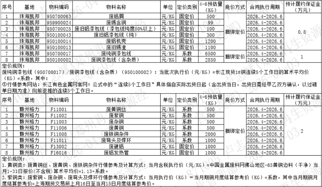 拟对以下物料价格进行竞价,下表中出售量仅供参考,最终数据以我司出售时过磅数量为准。竞价回收后,回收商不得以出售量与预估量不符提出任何异议。