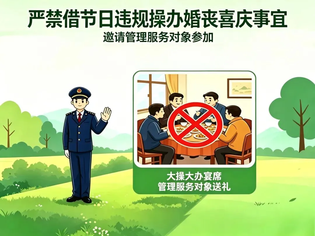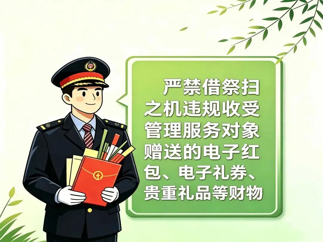 干部职工同志们:清明节将至,为进一步严明工作纪律,持之以恒纠“四风”树新风,巩固落实中央八项规定精神,营造良好的清明祭扫氛围。段纪委提醒全体干部职工:节日期间绷紧廉政这根弦,增强廉洁自律意识,守住底线,不踩红线,自觉做到“十个严禁”。