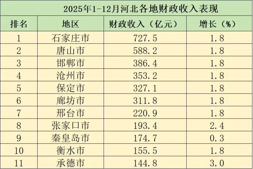 河北2025年省本级收入701.1亿元,增长1.8%。其中税收574.4亿元,增长3.4%;非税126.7亿元,下降5%。省本级的财政表现较好,成为支撑全省财政增长的关键力量。现在我们一起来看河北各地财政收入表现。