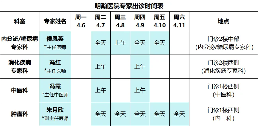 石家庄明瀚医院专家出诊表 | 4月6日-4月11日