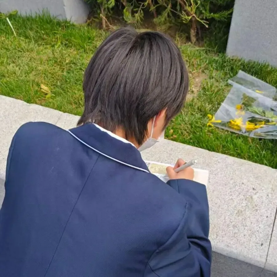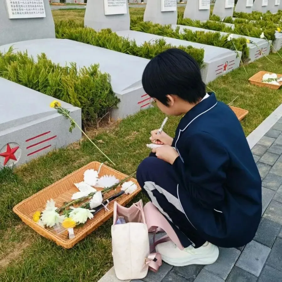 随后,同学们手持素洁白花,在老师引领下缓步走向烈士墓区。大家俯身轻拭碑上尘埃,将亲手书写的字条轻轻置于墓前——纸条上,是少年们对英烈的敬仰与告慰,更是传承精神的坚定誓言。同学们将白花郑重安放、深深鞠躬,以朴素而真挚的举动,寄托无限哀思。