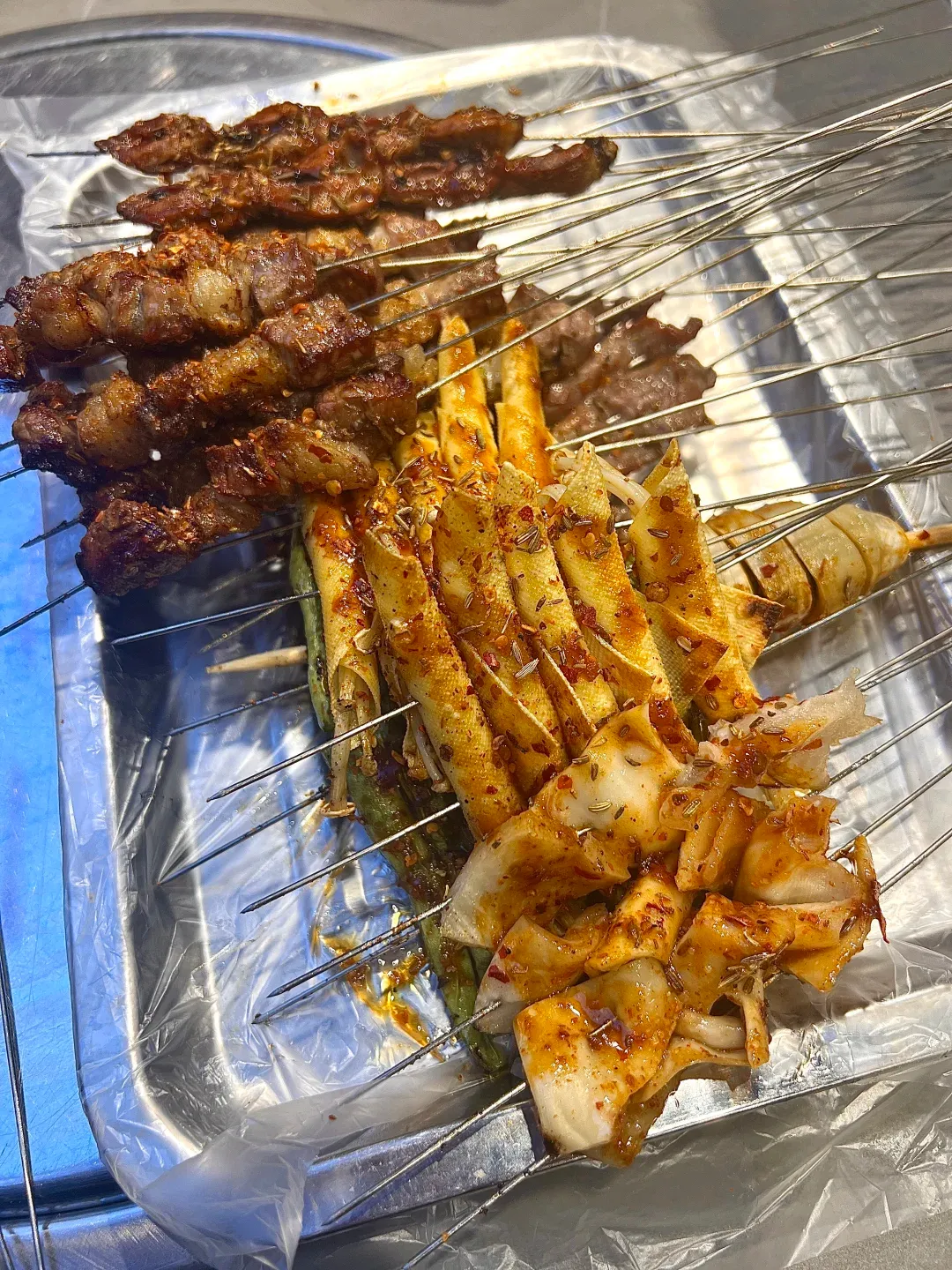 - 2 元 / 串的鱼豆腐、3 元 / 串的尖椒、10 元 / 份的韭菜、金针菇,烤得焦香入味,解腻又爽口,荤素搭配撸串不累!