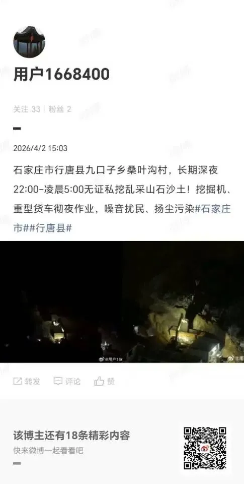 近日,行唐县九口子乡桑叶沟村村民持续反映:村内及周边山林地带,长期存在无证私挖乱采山石沙土的严重违法行为,且专选每日22:00—凌晨5:00深夜时段疯狂作业。挖掘机轰鸣、重型货车穿梭,彻夜不休,不仅严重破坏山体生态、侵占国有资源,更造成剧烈噪音扰民与扬尘污染,全村百姓夜夜难眠、苦不堪言,恳请监管部门立即严查、彻底取缔!