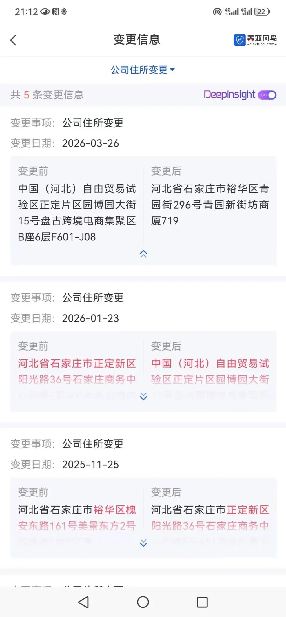 从工商信息来看,该公司2023年8月至今,住所地从裕华区到新华区,又回裕华区,再到正定新区,后迁至自贸试验区,再回裕华区,两年多来反复横跳了5次。