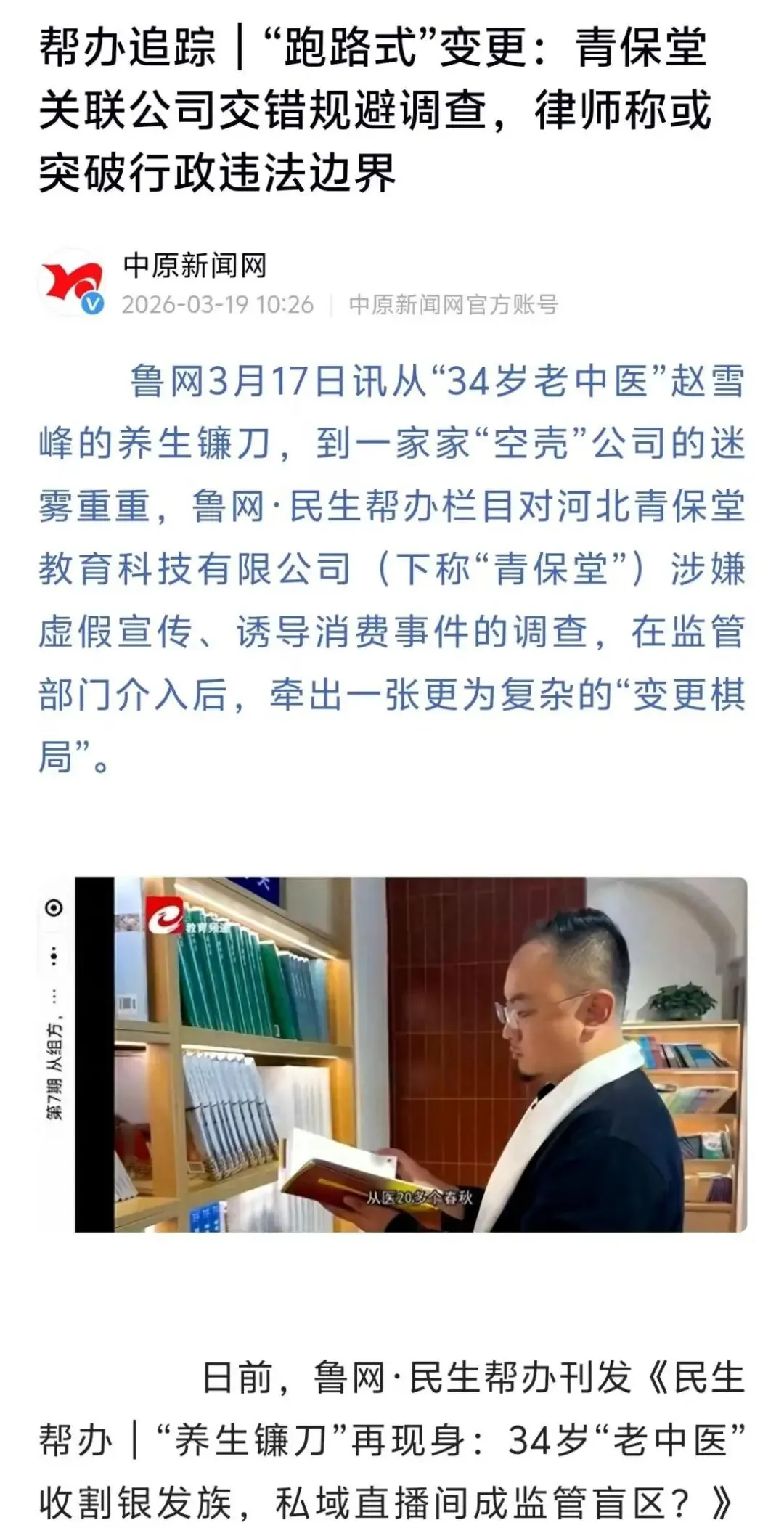 鲁网3月17日报道了《“跑路式”变更:青保堂关联公司交错规避调查,律师称或突破行政违法边界》一文。文中直指青保堂及其关联公司集群频繁变更、交叉持股、“失联”逃避监管的乱象——河北青保堂教育科技有限公司成立至今变更记录多达40余次,现更名为“河北历日科技有限公司”;其上级控股公司河北问答有课教育科技有限公司变更信息多达27条,在2024年8月因“住所失联”被列入经营异常后,竟于2025年9月16日发布注销公告。而这家正在清算的公司,此前还对外投资设立了石家庄艺升星途科技有限公司。