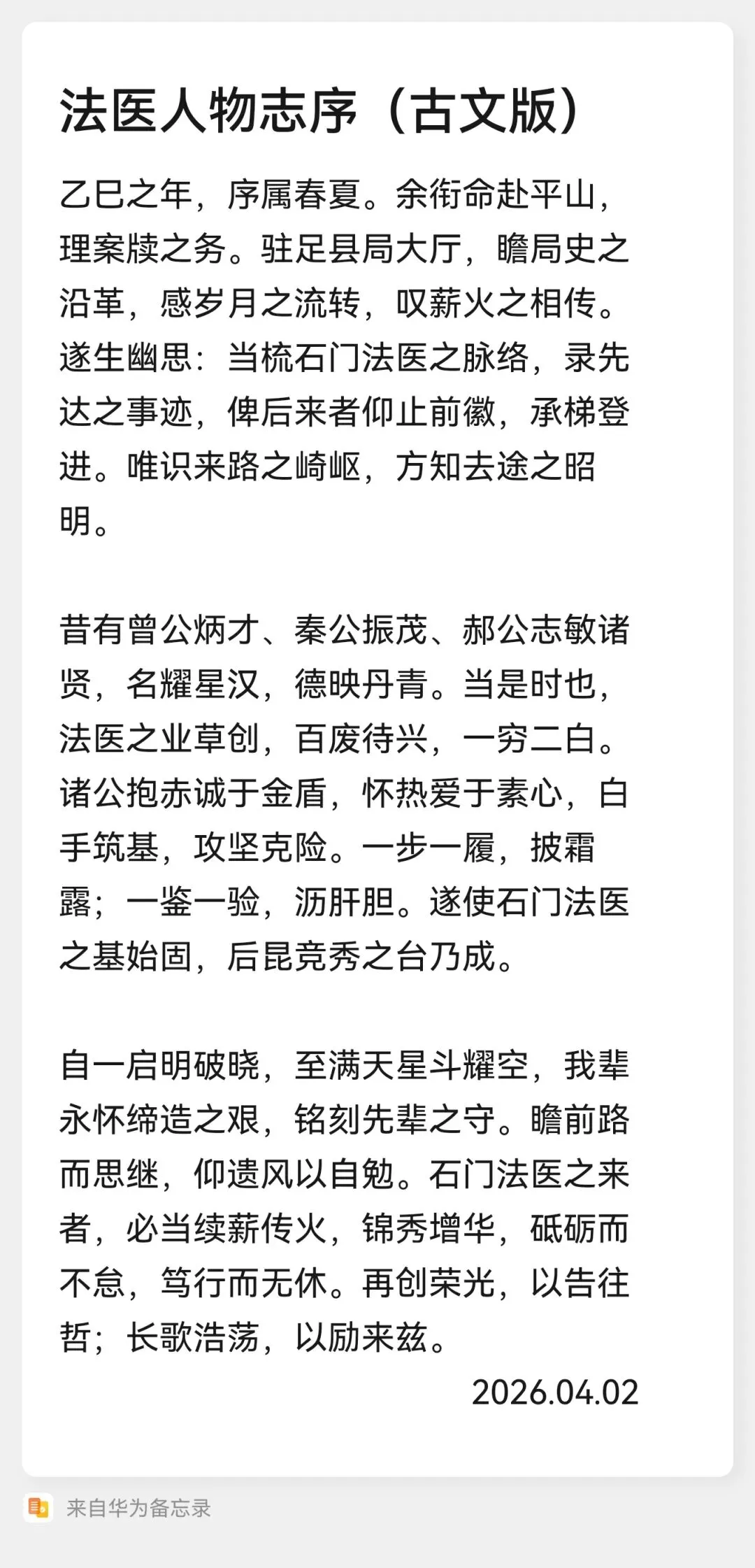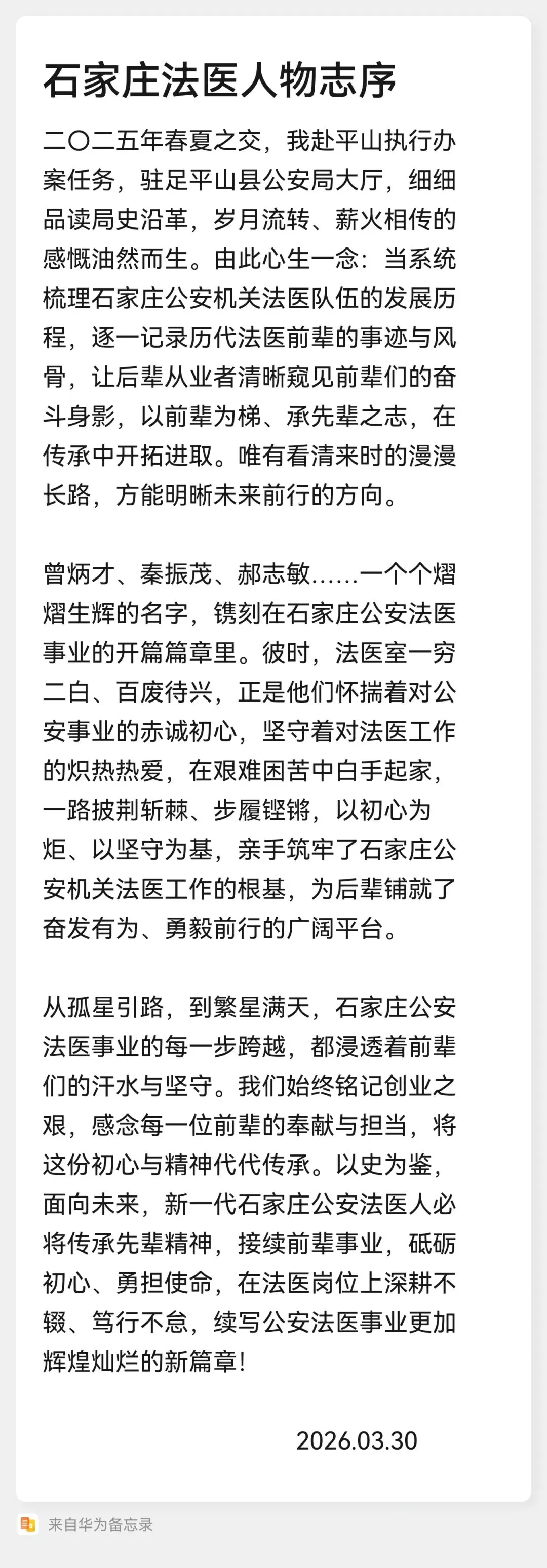 2025年春夏之交,我赴平山办案,观平山县局大厅中平山县局发展史,感叹时光易逝,遂起念要把石家庄公安机关法医逐一摸清,能够让今后公安机关的法医后辈清晰的看到前辈的身影,能够站在前辈肩膀上开拓进取,看清来时路,方知未来的方向!