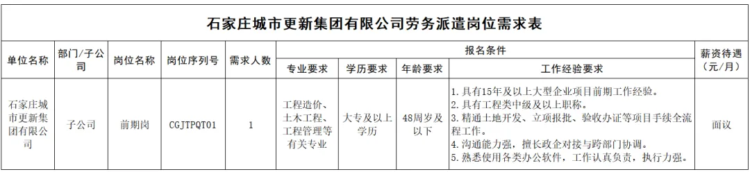 据工作需要,石家庄城市更新集团有限公司特委托石家庄市国经人力资源管理有限公司面向社会公开招聘劳务派遣制人员1名。现将具体招聘事宜公告如下: