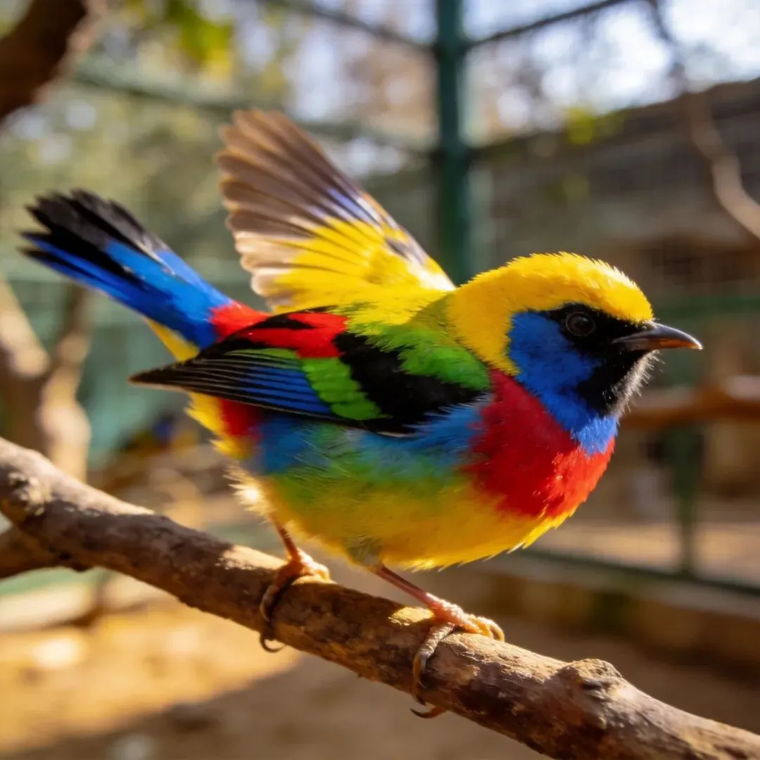 七彩文鸟有多美?黄、蓝、红、绿、黑五色羽毛,娇小玲珑,像会飞的宝石。