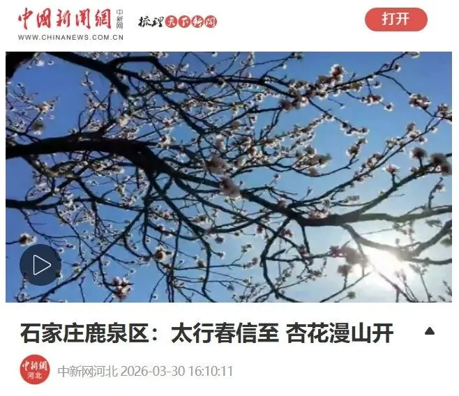 中新网河北新闻3月30日电 (杨波 吴坤 刘海龙)春风拂过石家庄鹿泉上寨乡,千亩杏花次第绽放,漫山粉白,绘就一幅水墨太行春山图。远望,枝头繁花似锦,苍枝映雪;风过,花枝摇曳,清香满谷。游人漫步山间,徜徉花海,在山野清幽里,拥抱鹿泉独有的春日浪漫。满目繁花竞秀,尽览田园诗意,尽在太行深处这一抹春色。(完)
