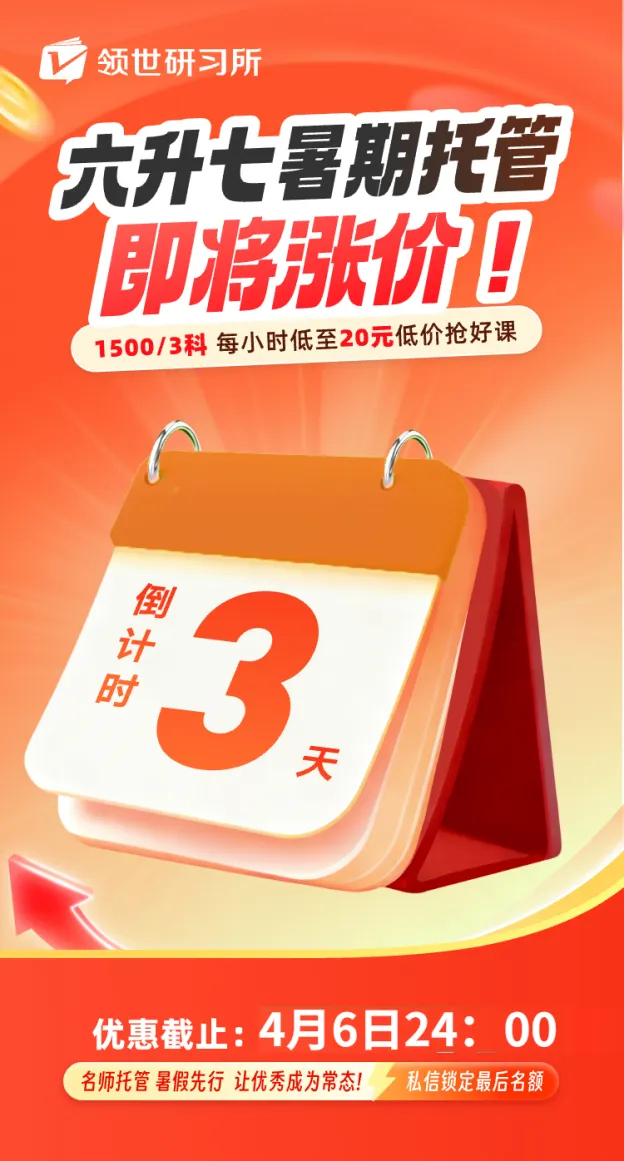 今年领世培优暑期先修课,语数英三科只要1500元(4月7日截止),比盲目折腾择校划算多了。感兴趣的家长抓紧扫码咨询。