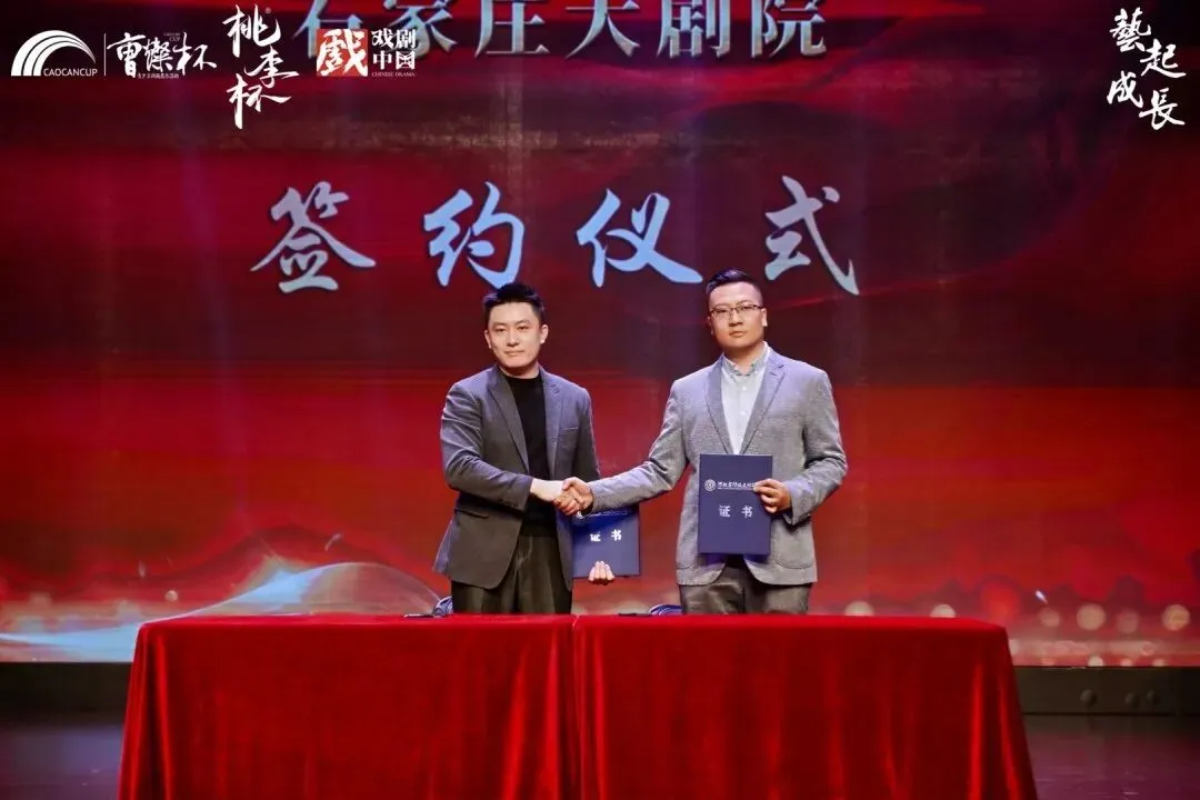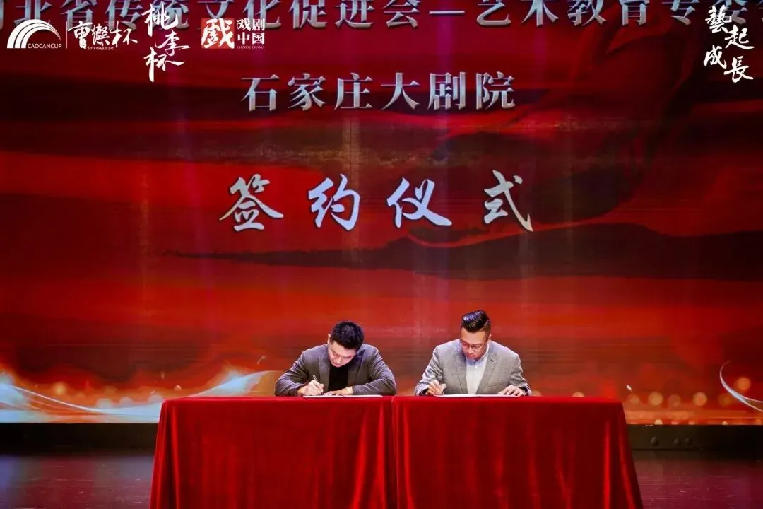 河北省传统文化促进会副秘书长、艺术教育专委会主席苏思豪(左)与石家庄大剧院营销总监王晨(右)与上台进行签约仪式!