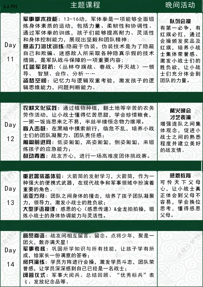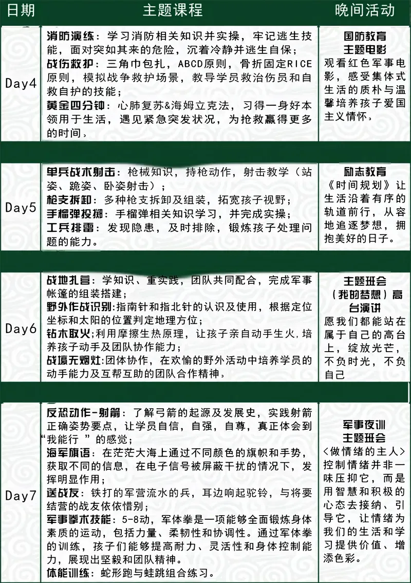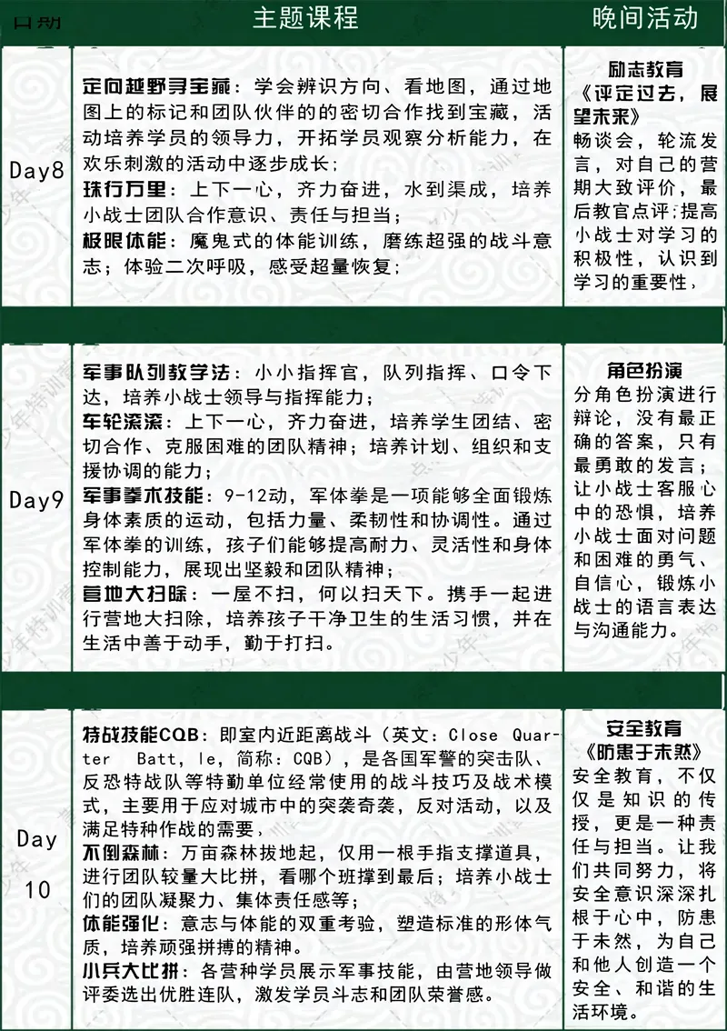 开营前7-14天内取消行程,可无损改期。如需退营,退款50%
