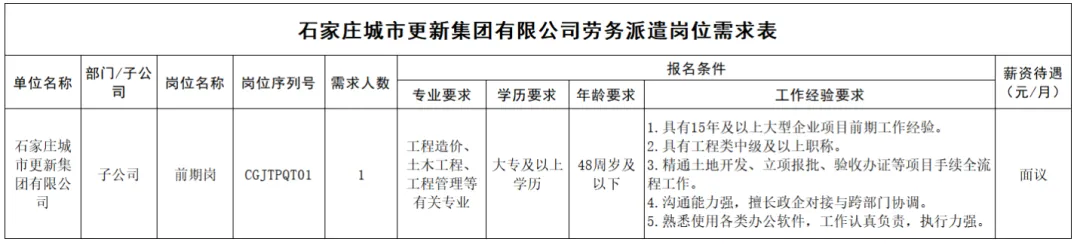 据工作需要,石家庄城市更新集团有限公司特委托石家庄市国经人力资源管理有限公司面向社会公开招聘劳务派遣制人员1名。现将具体招聘事宜公告如下: