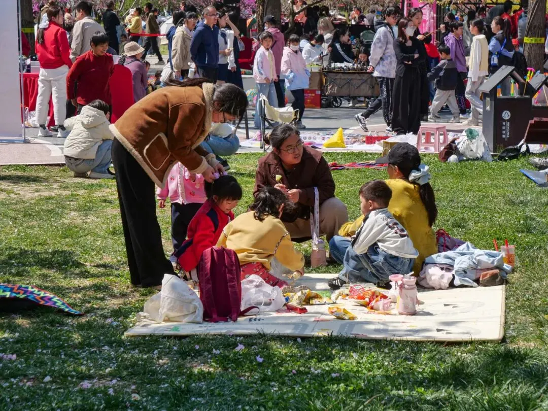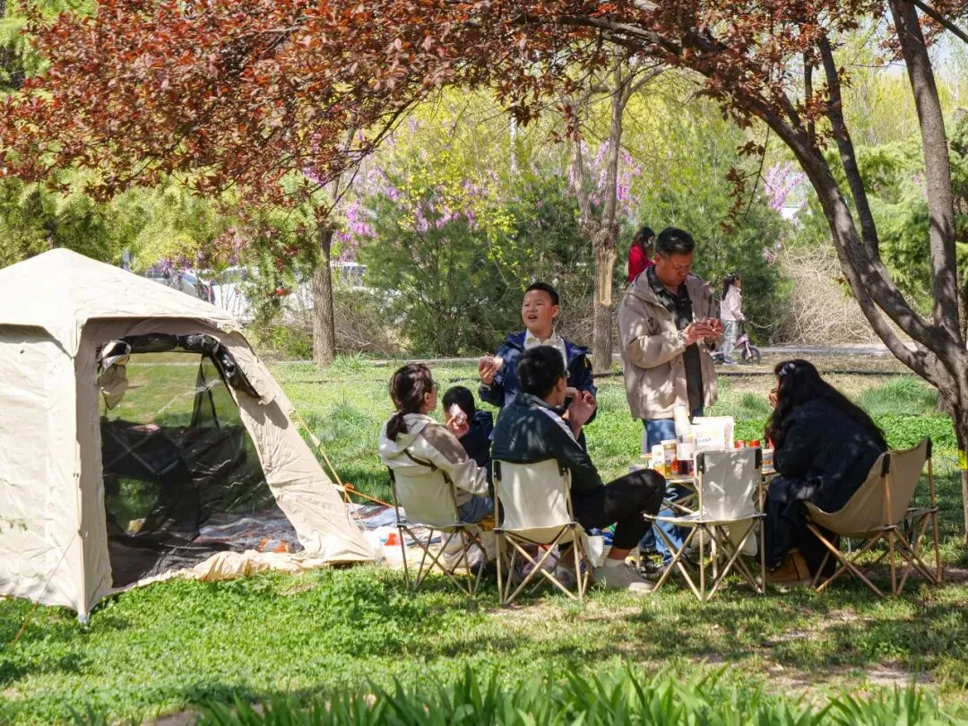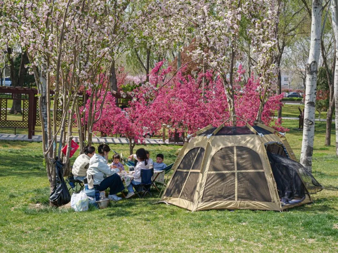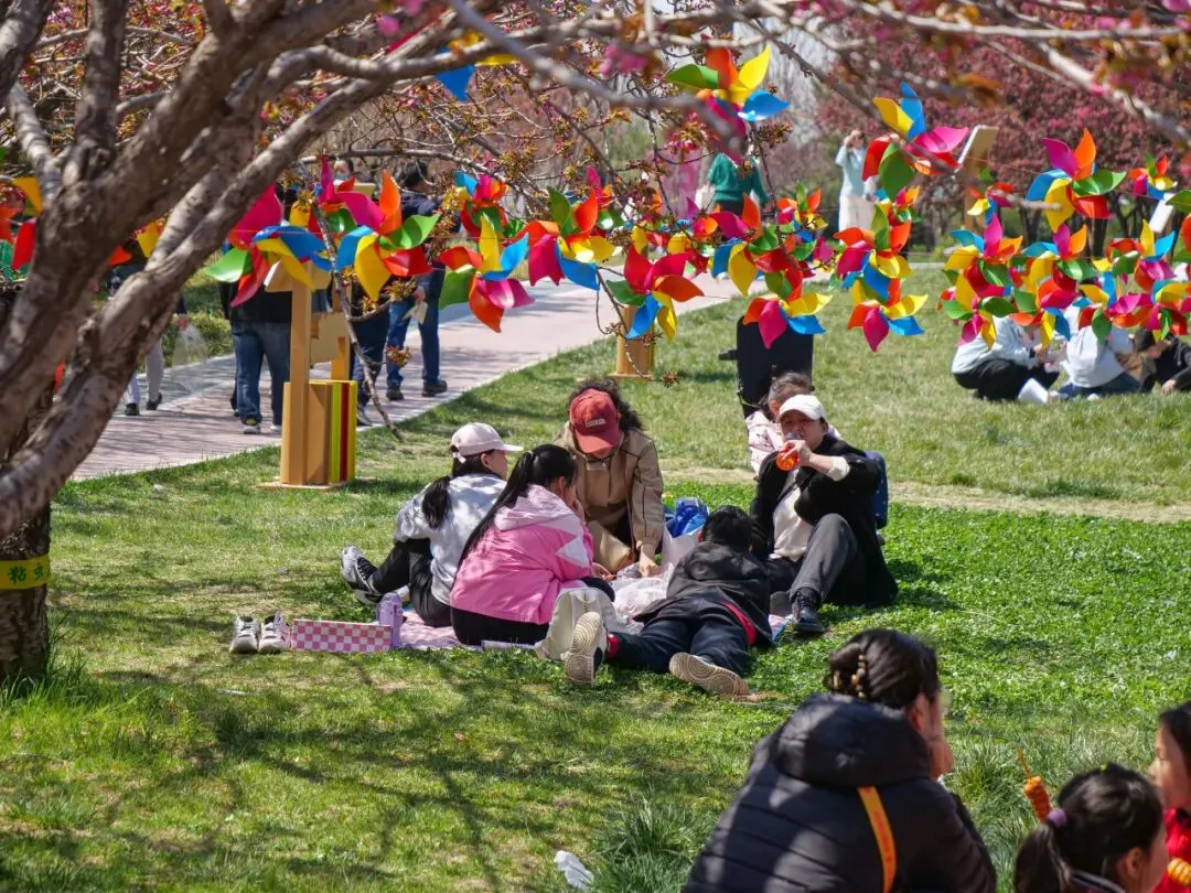 微风拂过樱枝,花瓣随风飘落,草坪上更是一派惬意景象。不少游客带着野餐垫、帐篷,围坐在一起,伴着漫天樱雨,分享美食、畅谈心事,孩子们在草坪上追逐嬉戏,阳光、樱花、欢笑交织在一起,解锁春日休闲新方式,感受栾城春日的松弛与浪漫。