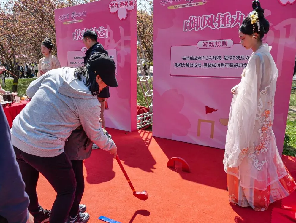 当国风雅韵碰撞烂漫樱景,便是一场跨越千年的相遇。开幕式上,“状元及第——马到成功”汉服游园活动惊艳亮相,身着各式汉服的表演者身姿窈窕,步履轻盈,穿行在樱林之间,衣袂飘飘与粉樱相映如画,宛若自古风长卷中款款而来。游客们也身着汉服参与其中,体验六艺挑战、金榜提字,在沉浸式体验中,感受三苏文脉的深厚底蕴与国风之美。