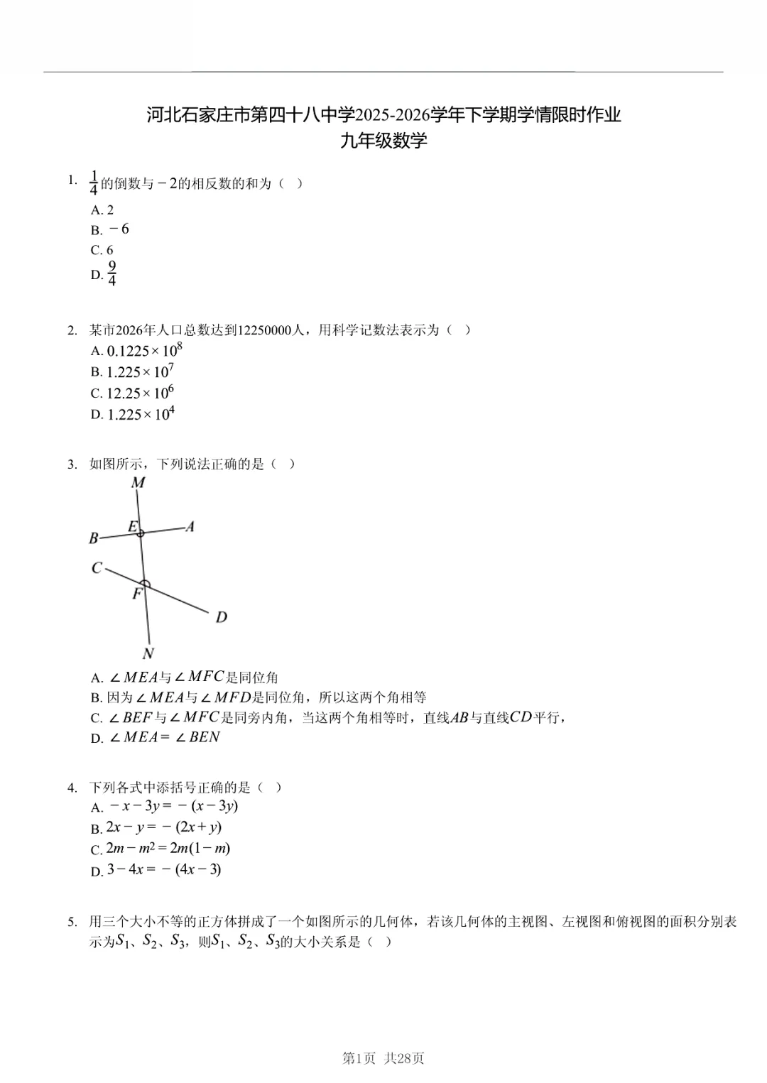 这两天给儿子睿睿做了这套石家庄四十八中学九年级数学限时作业,整体难度贴合校内学情检测,题量适中,侧重基础巩固和细节考查,很适合孩子练速度、练手感,睿睿做完说整体做下来比较顺畅,没有特别偏难的题目。