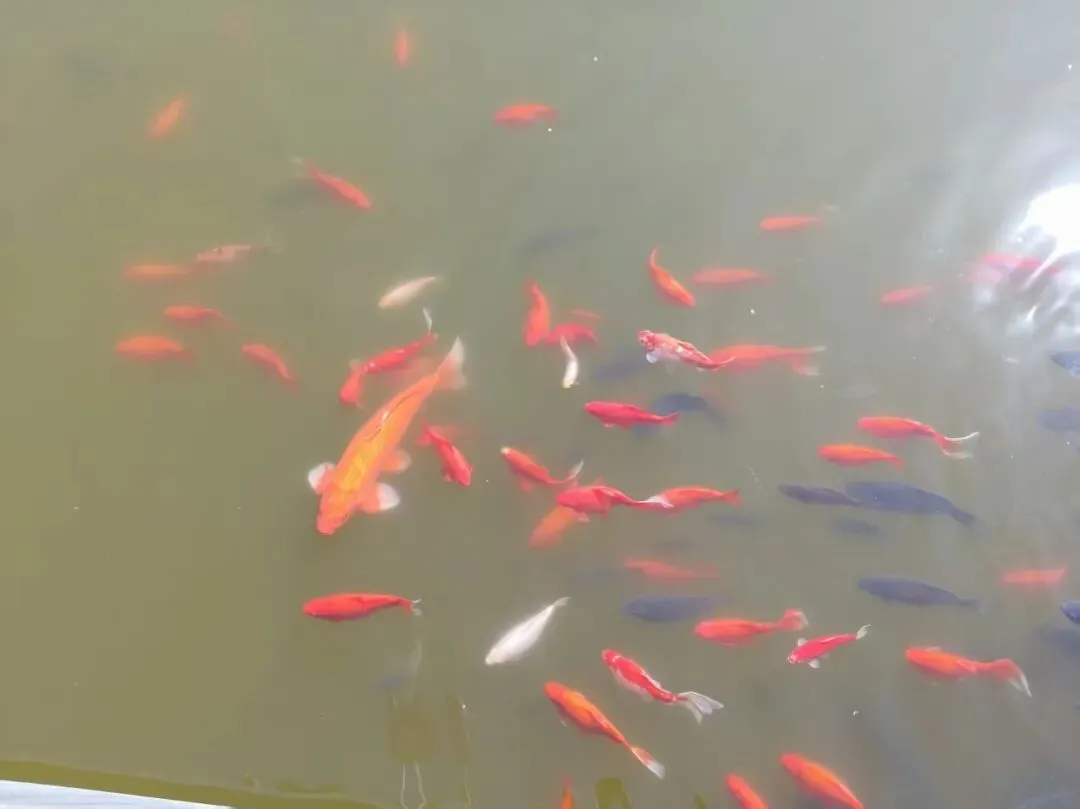 碧塘观鱼那边,锦鲤又大又肥,红白相间,挤在一起抢食,水花四溅。