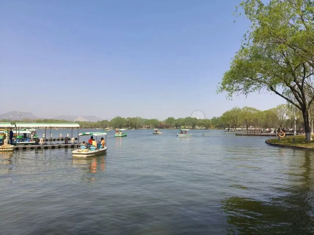 湖边有人在划船。春风拂面,柳枝轻摇,这才是春天该有的样子。