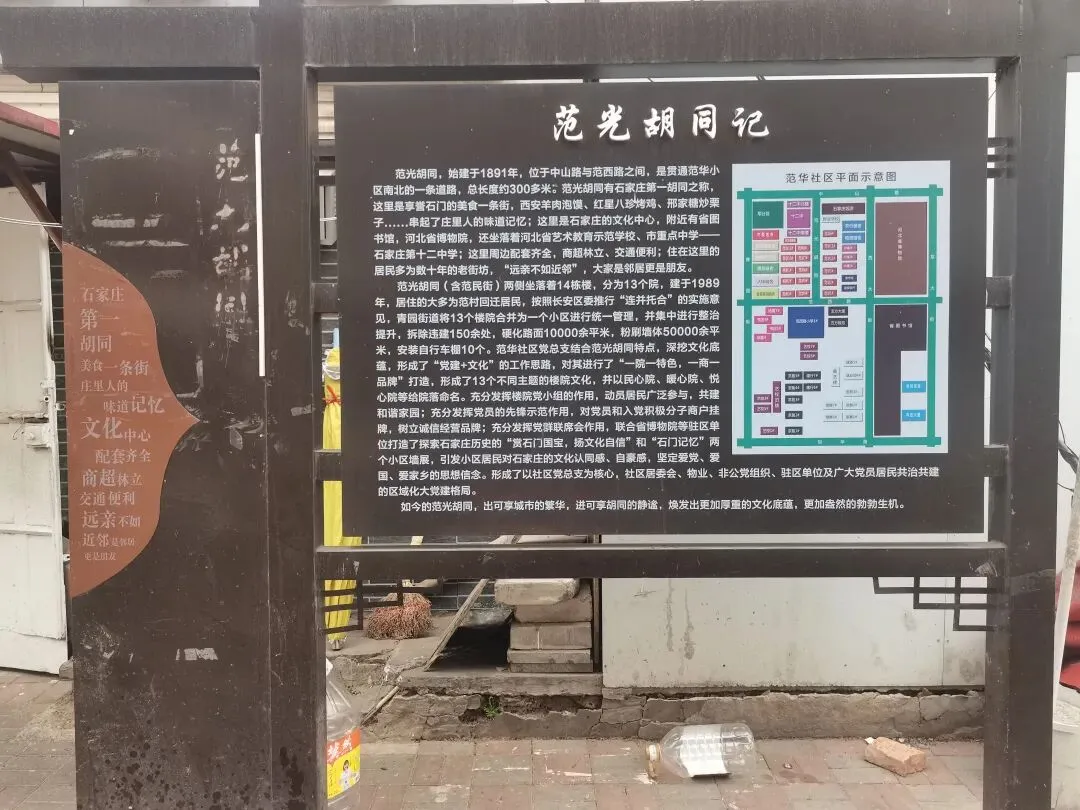 那胡同就是范光胡同,范光胡同有着石家庄第一胡同美称。范光胡同始建于1891年,位于中山路与范西路之间,是贯通范华小区南北的一条道路,总长度约300米。这里有享誉石门的美食一条街,西安羊肉泡馍、红星八珍烤鸡、邢家糖炒栗子……串起了庄里人的味觉记忆。