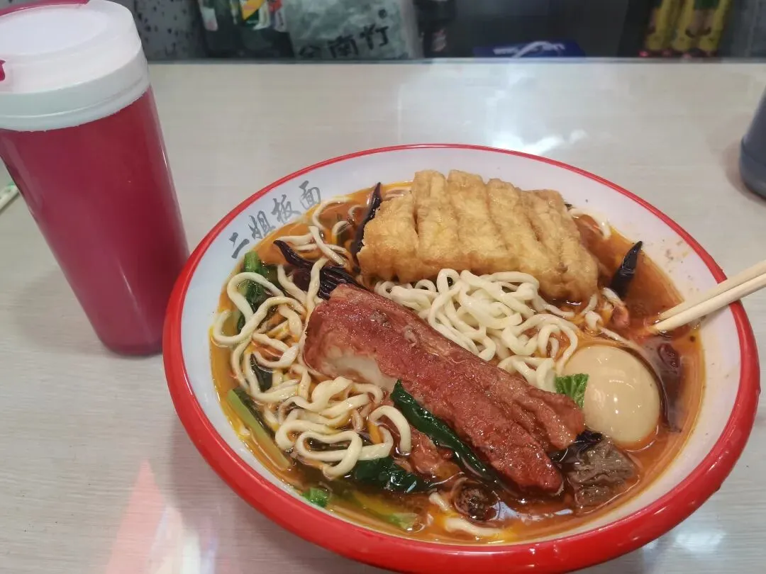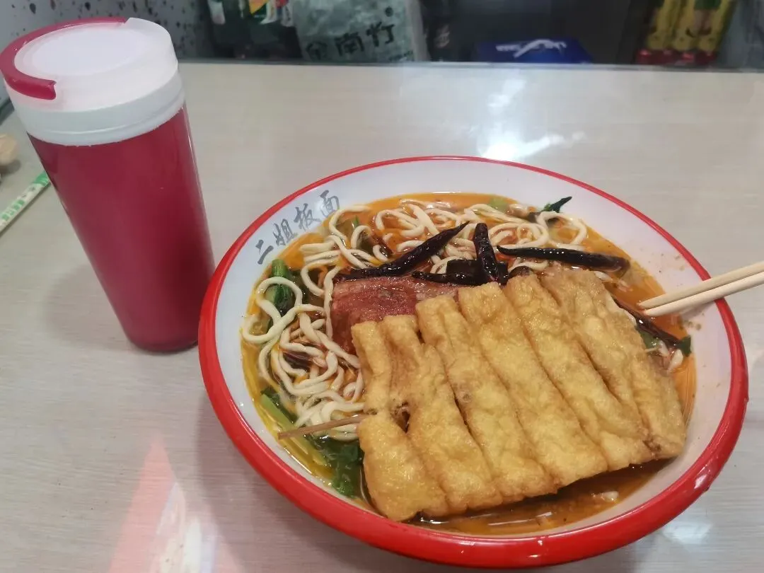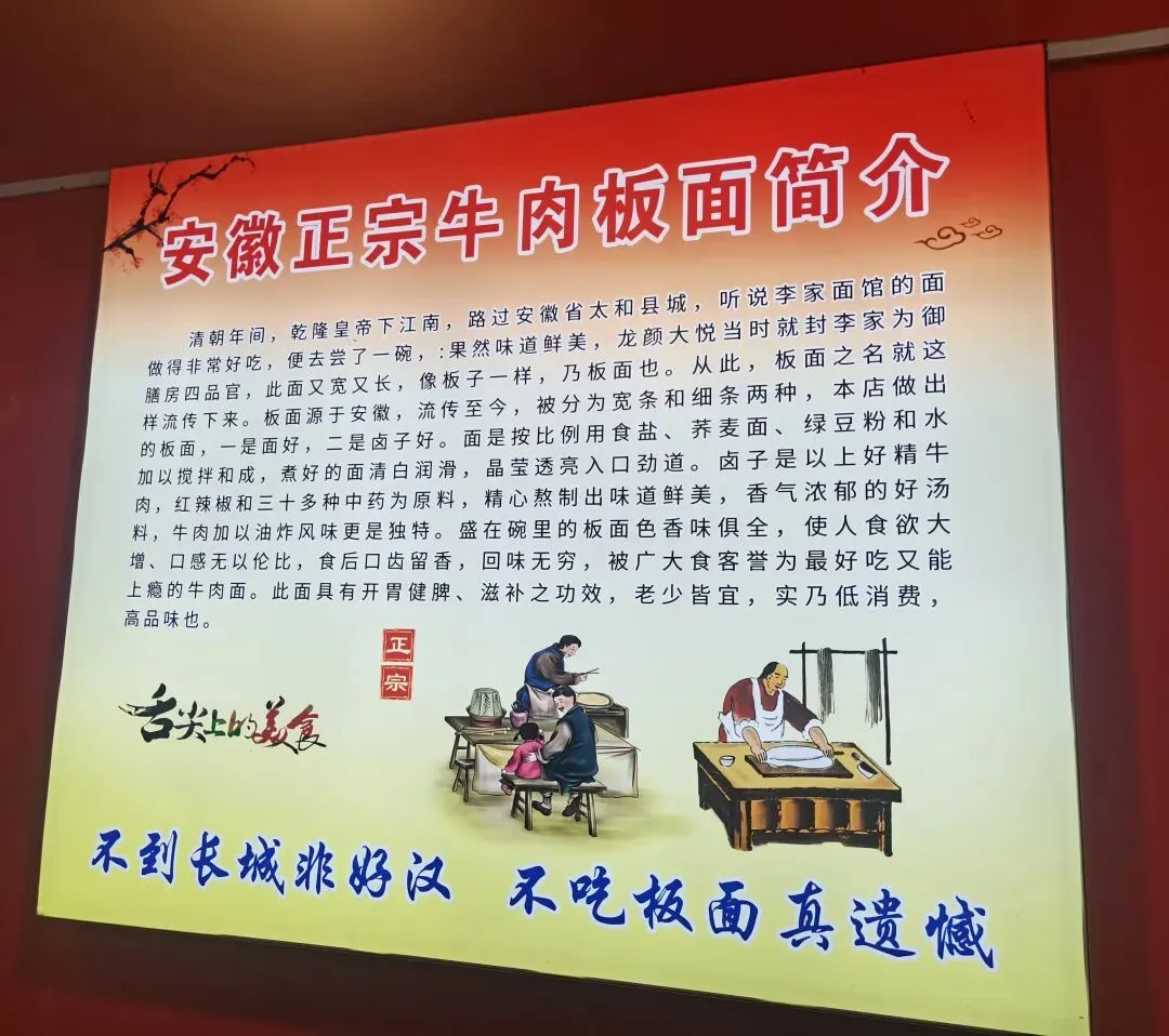 那面就是被戏称为“石家庄特产”的安徽牛肉板面。据公开报道,板面起源于安徽阜阳市的太和县,属于当地的地方小吃,主要是羊肉板面。上世纪80、90年代,一大批安徽阜阳人北上打工,石家庄作为一座“火车拉来的城市”,是当时全国重要的铁路枢纽,因此,板面就随着这些安徽人在石家庄生根发芽。后来,河北人对安徽板面进行了改良,使其更适应当地人的口味,比如将原先板面里的羊肉替换为牛肉,于是有了“安徽正宗牛肉板面”的做法。 那味道当然是板面的味道。 吃一条香辣的热乎乎油汪汪的粗面条,顶饿又舒服,再来一碗面汤,原汤化原食,虽然高油高盐高碳水,可实惠好吃还简单。对跑马拉松的人来说是最好的不二选择。当坐在小板凳上,听着老板用方言招呼客人,吃着热气腾腾的面,那味道美得难以言语。 不到长城非好汉,不吃板面真遗憾!