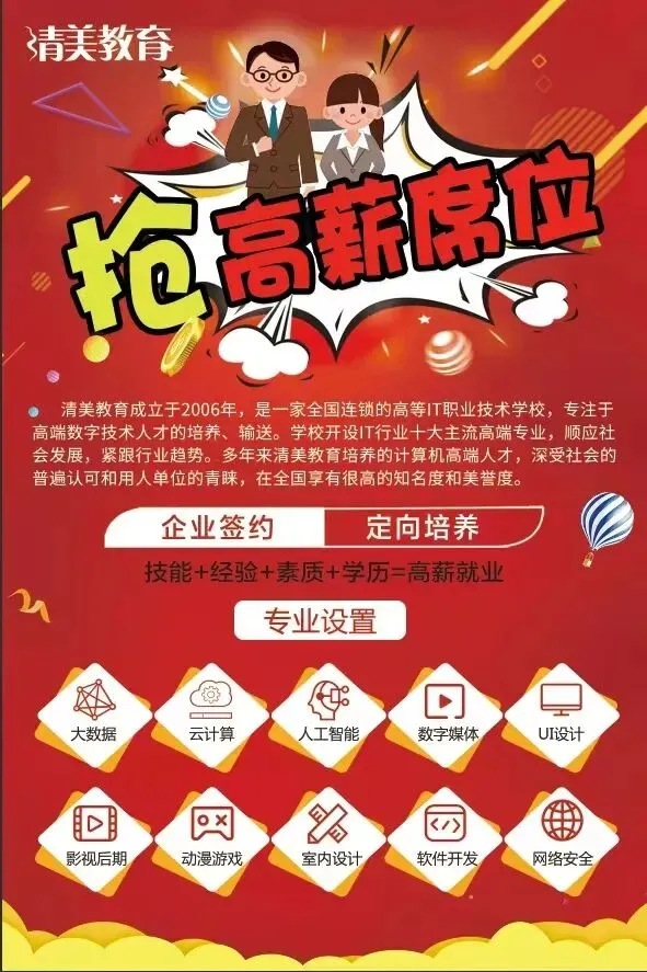 石家庄清美教育针对大专毕业生,高中毕业生,初中毕业生,待业青年,开设专业:人工智能,AIGC,Ai数媒,虚拟现实,云计算,电商美工,新媒体运营,动漫游戏,室内设计,网络云运维。