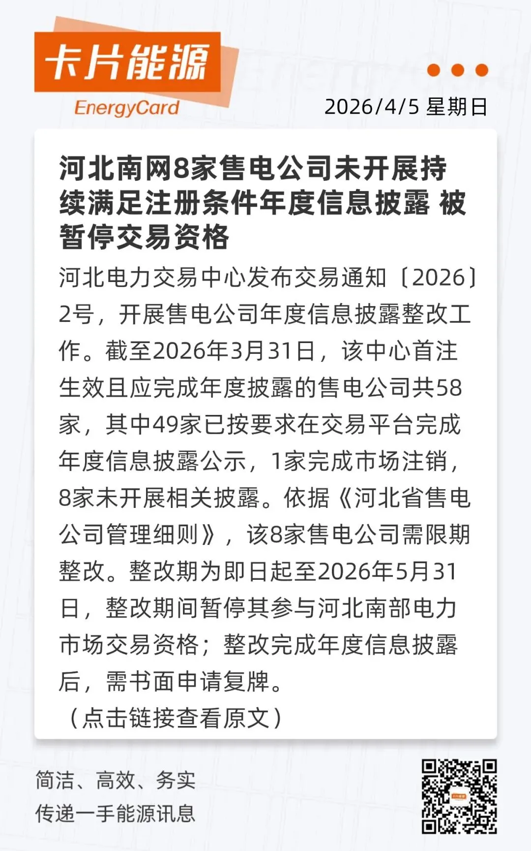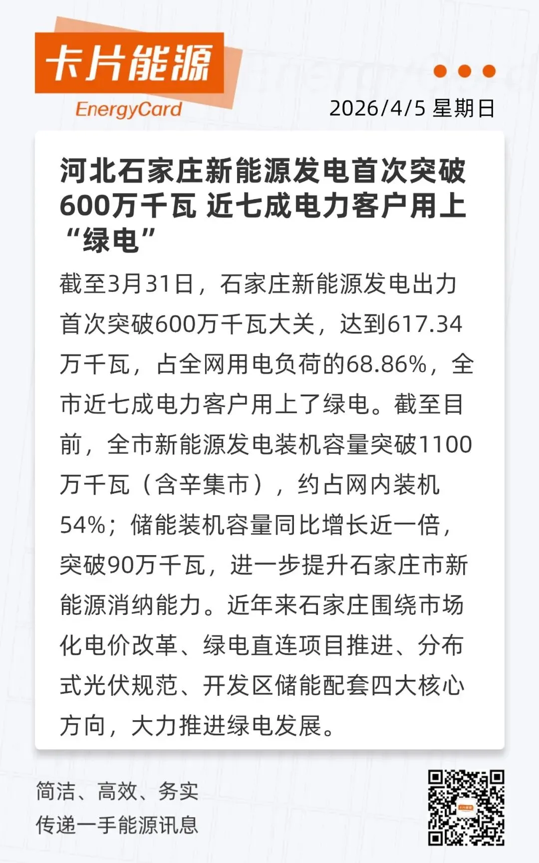 卡片晨讯:河北石家庄新能源发电首次突破600万千瓦 近七成电力客户用上“绿电”(附音频解读)